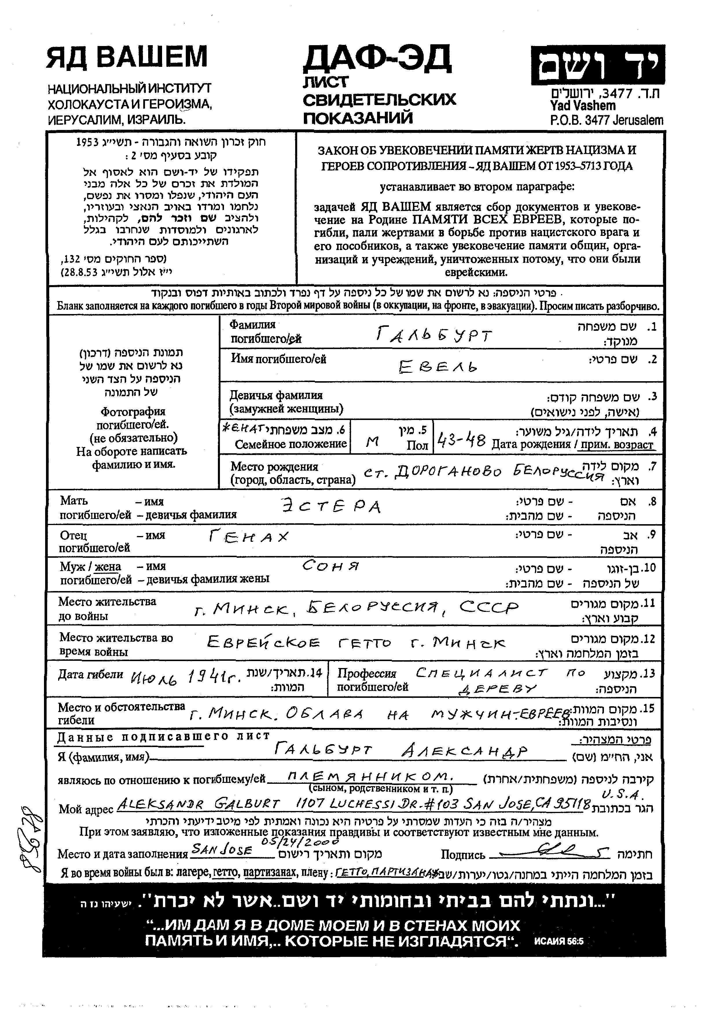 Yevel Galburt wurde in Doroganovo, Weißrussland (UdSSR) geboren. Er war der Sohn von Genakh und Estera. Er war Wood und mit Sonya Verheiratet. Vor dem Zweiten Weltkrieg lebte er in Minsk, Weißrussland (UdSSR). Während des Krieges war er in Minsk, Weißrussland (UdSSR).