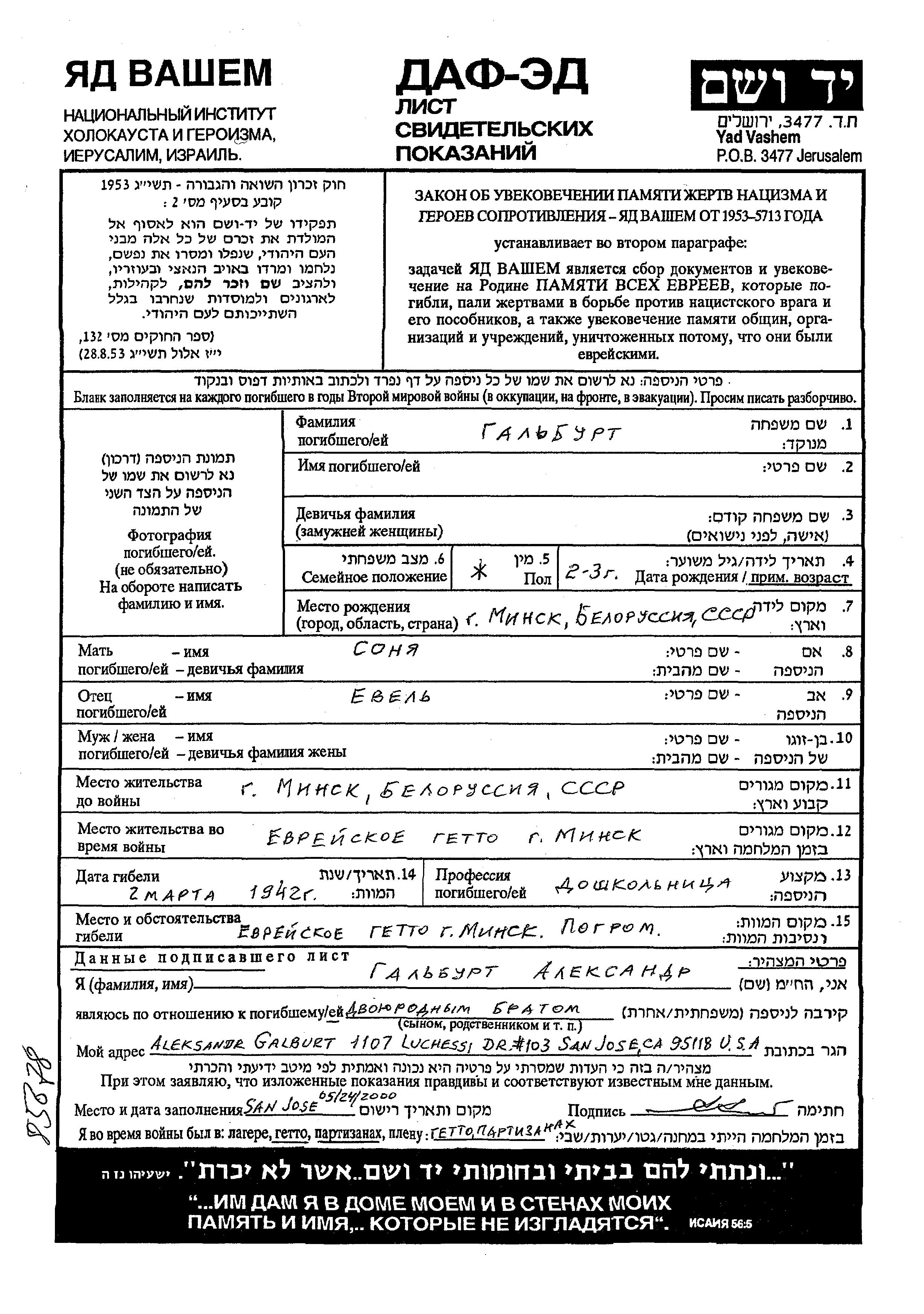 Galburt Vorname unbekannt Minsk, Weißrussland (UdSSR) Gedenkblatt