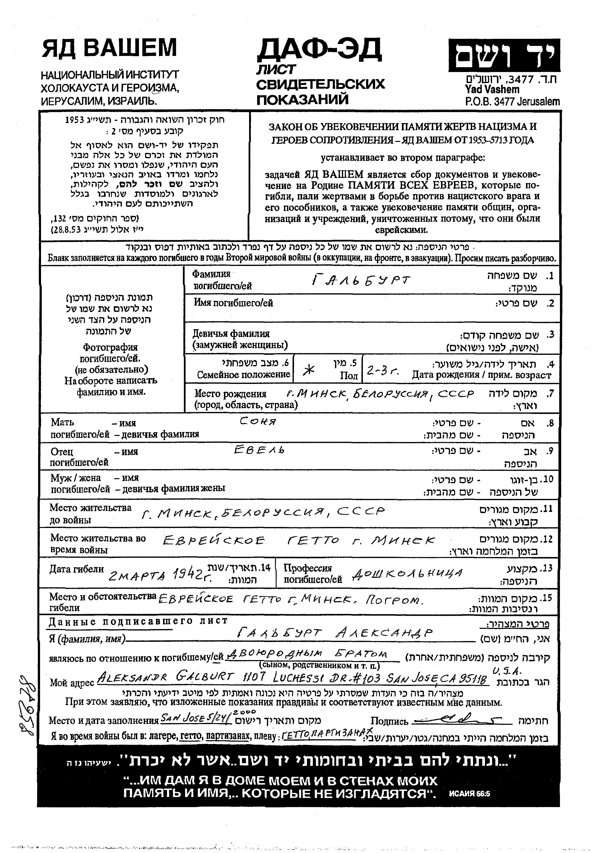 Galburt Vorname unbekannt Minsk, Weißrussland (UdSSR) Gedenkblatt