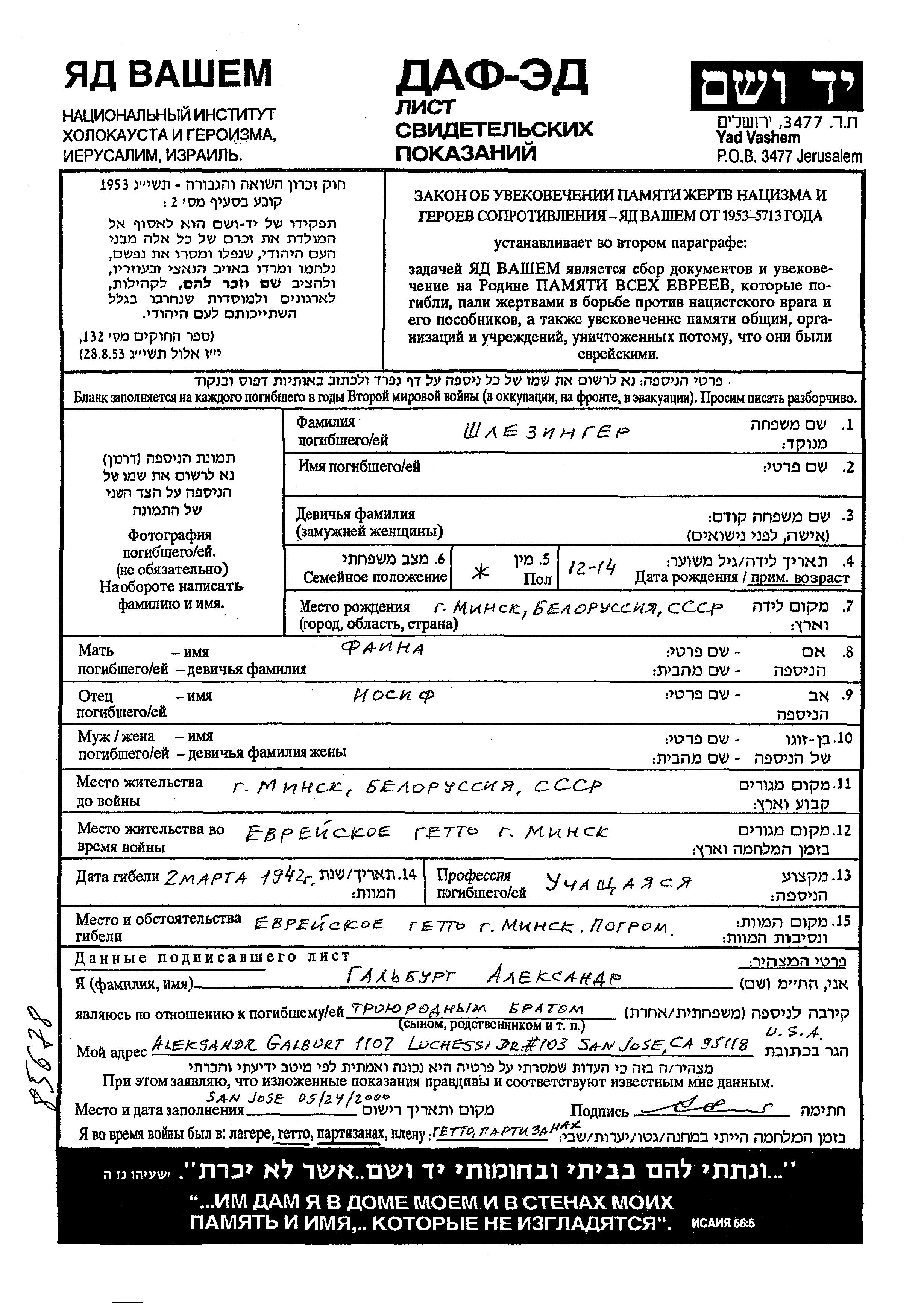 Shlezinger Vorname unbekannt Minsk, Weißrussland (UdSSR) Gedenkblatt