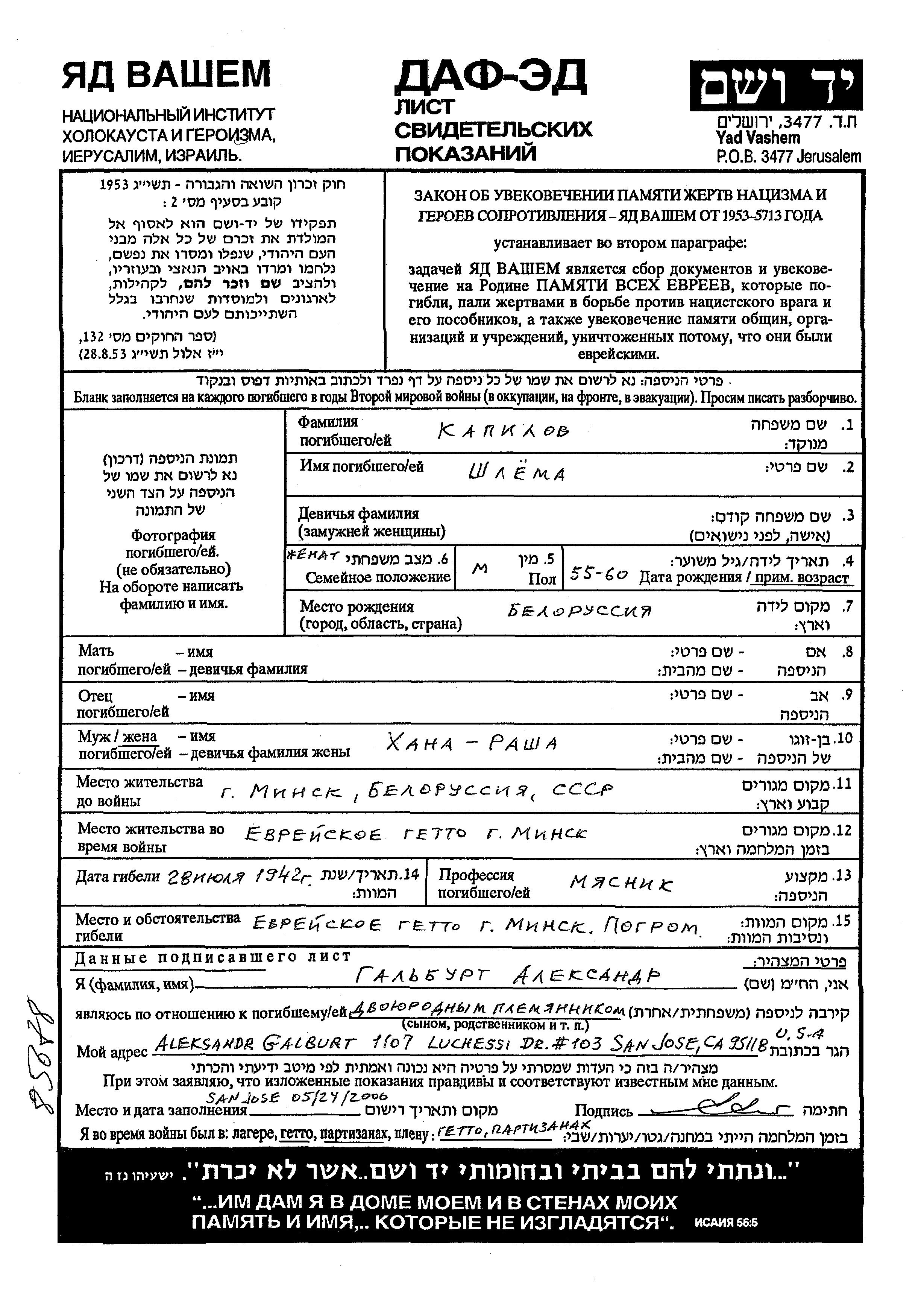 Shlyoma Kapilov wurde in Weißrussland (UdSSR) geboren. Er war Metzger/-in und mit Rasha Khana Verheiratet. Vor dem Zweiten Weltkrieg lebte er in Minsk, Weißrussland (UdSSR). Während des Krieges war er in Minsk, Weißrussland (UdSSR).