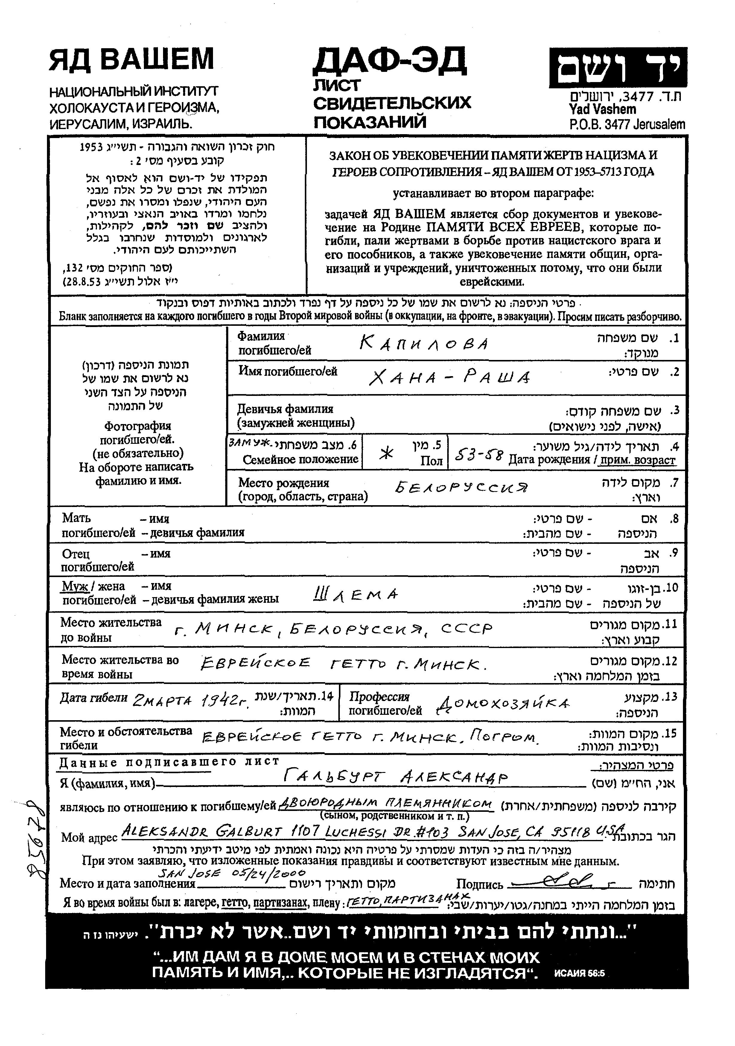 Rasha Khana Kapilov wurde in Weißrussland (UdSSR) geboren. Sie war Hausfrau und mit Shlyoma Verheiratet. Vor dem Zweiten Weltkrieg lebte sie in Minsk, Weißrussland (UdSSR). Während des Krieges war sie in Minsk, Weißrussland (UdSSR).