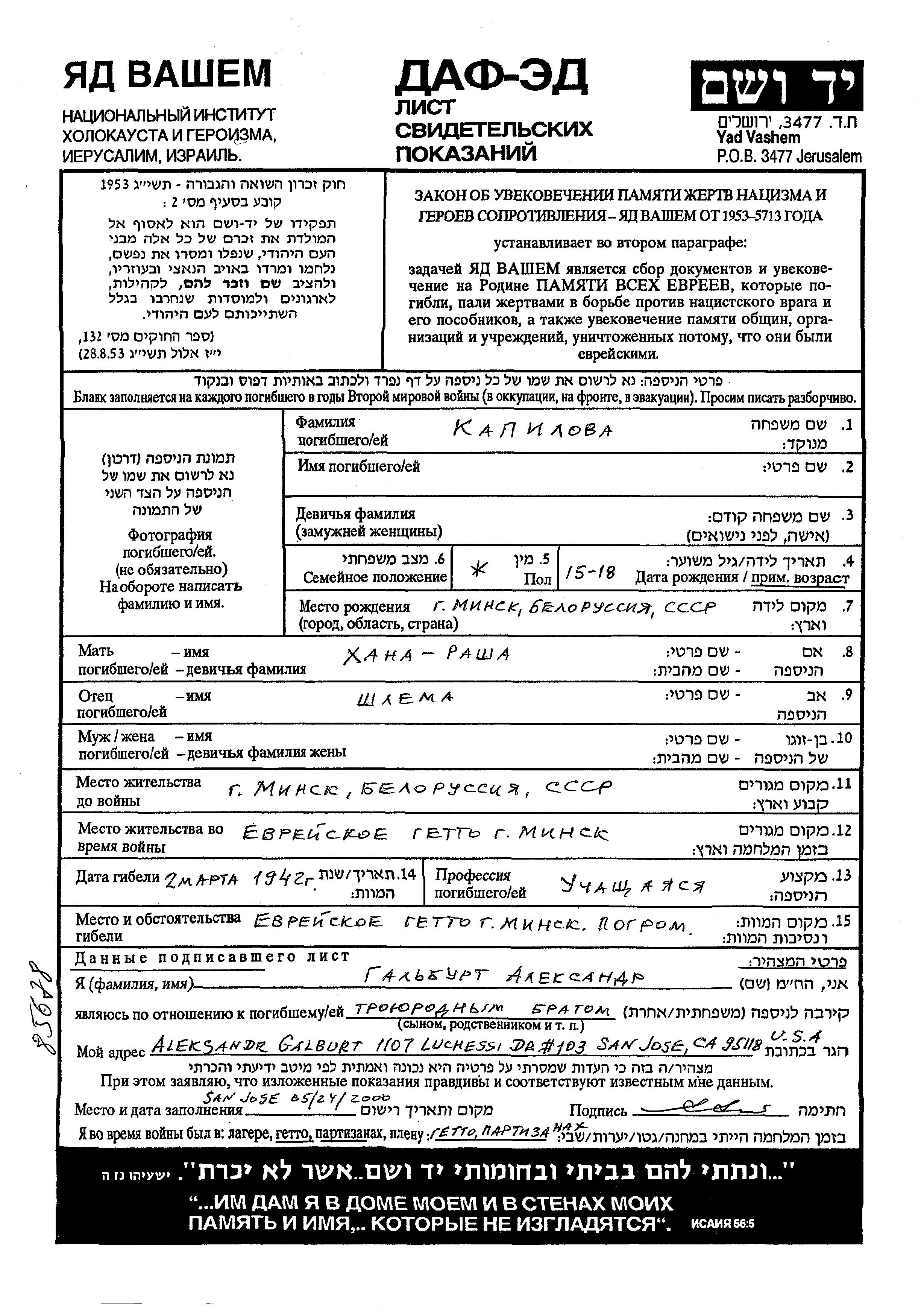 Vorname unbekannt Kapilov wurde in Minsk, Weißrussland (UdSSR) geboren. Er war der Sohn von Shlema und Rasha Khana. Er war Schüler/-in. Vor dem Zweiten Weltkrieg lebte er in Minsk, Weißrussland (UdSSR). Während des Krieges war er in Minsk, Weißrussland (UdSSR).