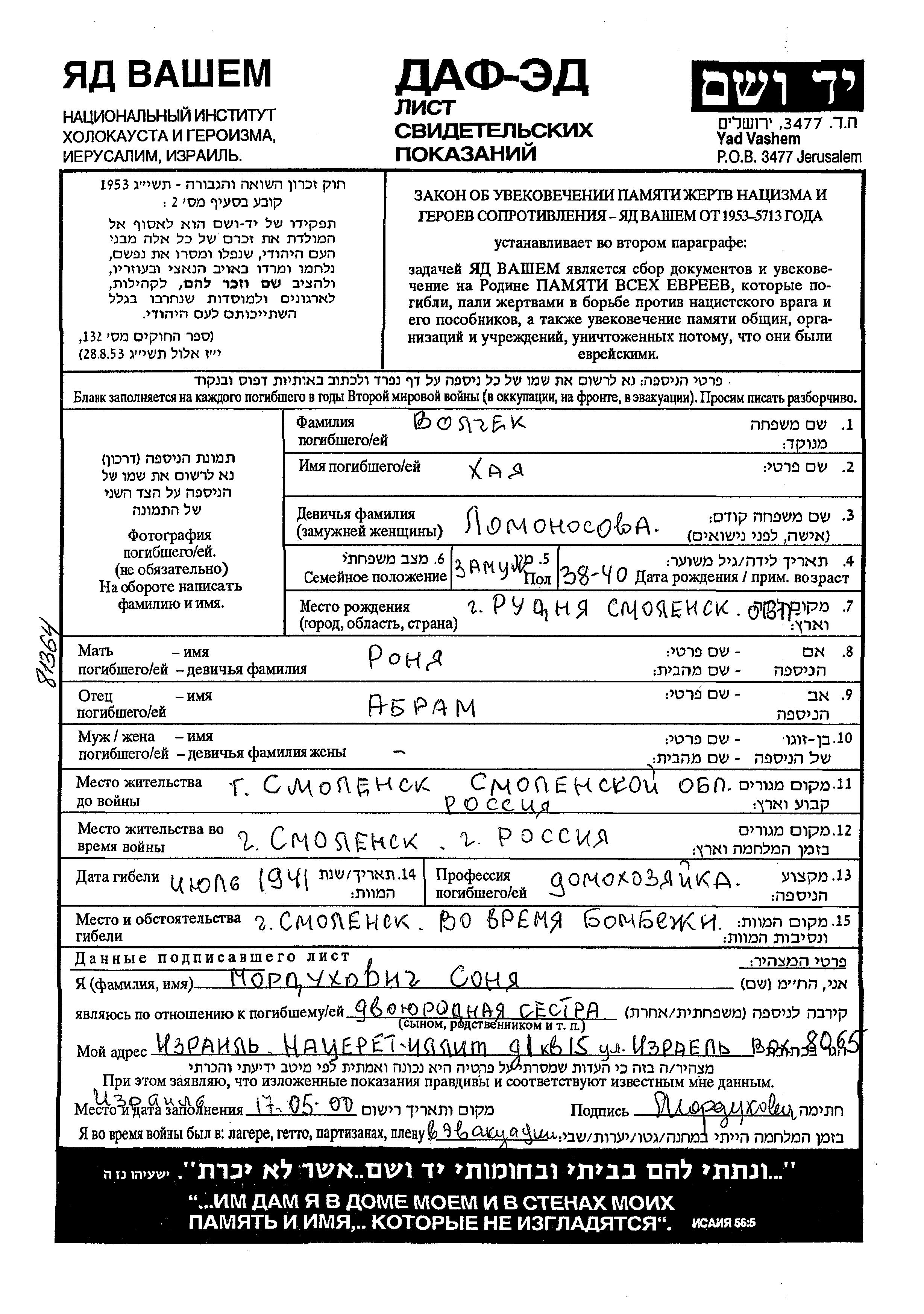 Khaia Volchek, geb. Lomonosov wurde in Rudnya, Russland (UdSSR) geboren. Sie war die Tochter von Abram und Ronya. Sie war Hausfrau und Verheiratet. Vor dem Zweiten Weltkrieg lebte sie in Smolensk, Russland (UdSSR). Während des Krieges war sie in Smolensk, Russland (UdSSR).
