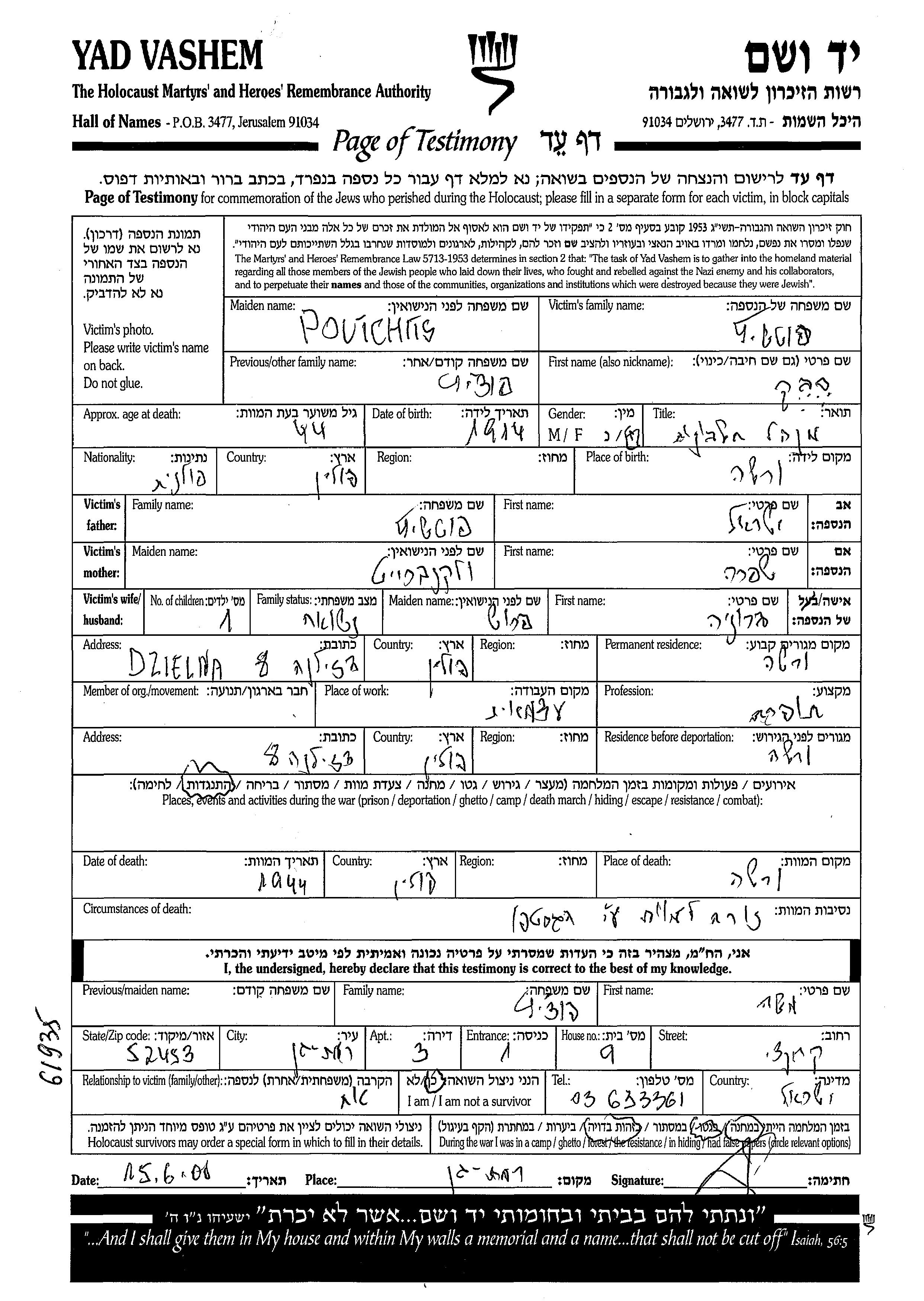 Sevek Puchitz wurde im Jahr 1914 in Warszawa, Polen geboren. Er war der Sohn von Yisrael und Shifra. Er war Buchhalter/-in und mit Bronia, geb. Frosh Verheiratet. Vor dem Zweiten Weltkrieg lebte er in Warszawa, Polen. Während des Krieges war er in Warszawa, Polen.