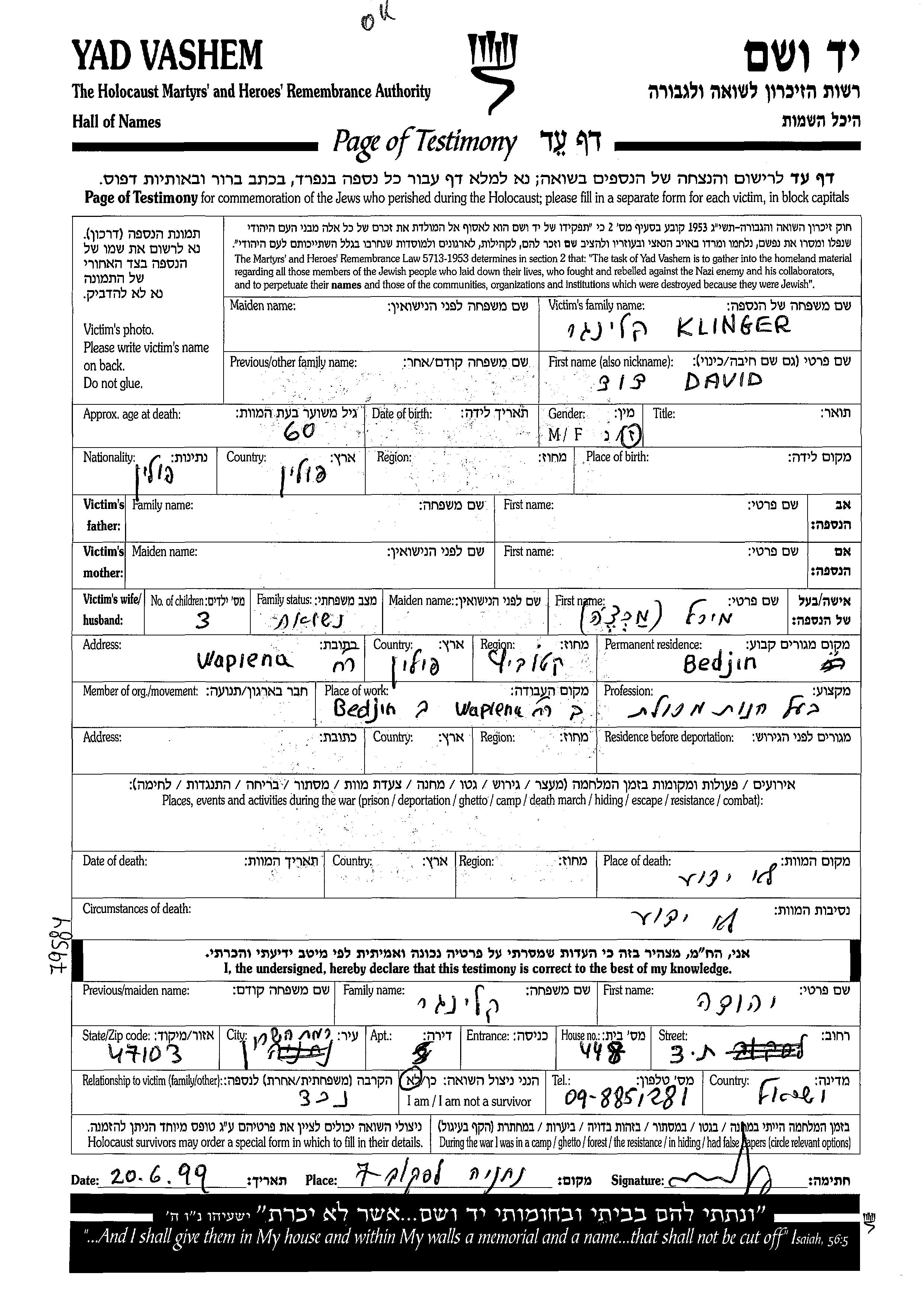 David Klinger wurde in Polen geboren. Er war Besitzer/-in eines lebensmittelgeschäfts und mit Mikhal Makhla Verheiratet. Vor dem Zweiten Weltkrieg lebte er in Bendzin, Polen.