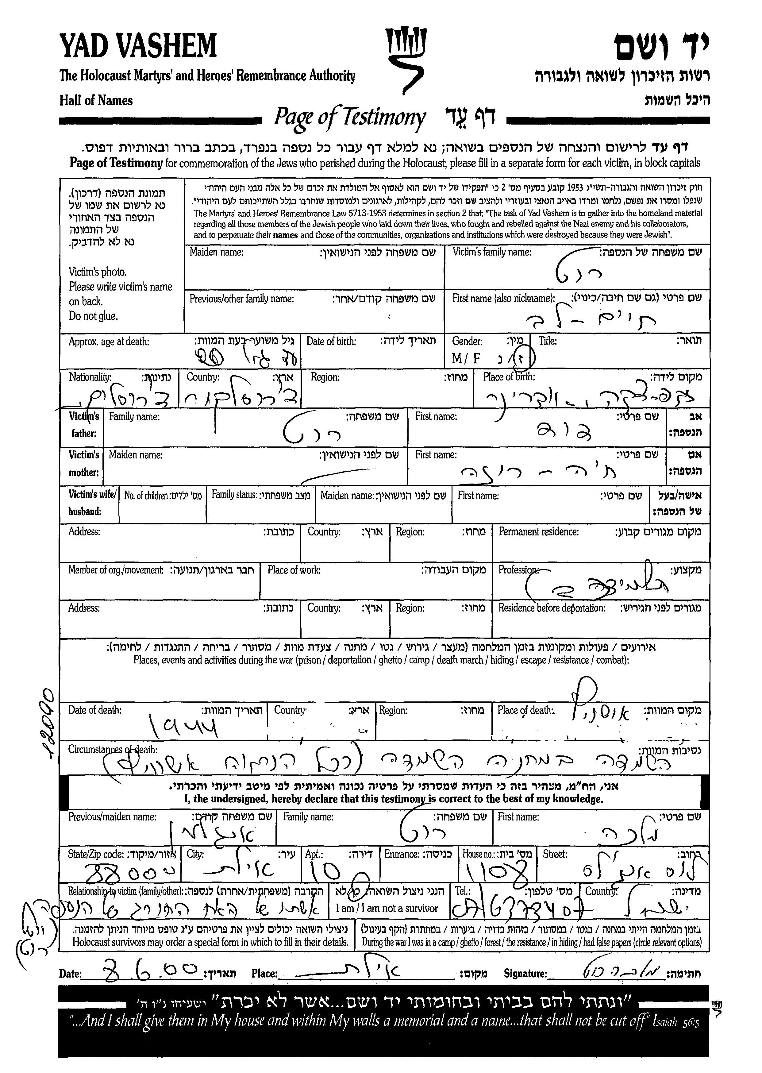 Rut Khaim Lev unbekannter Ort, Gedenkblatt