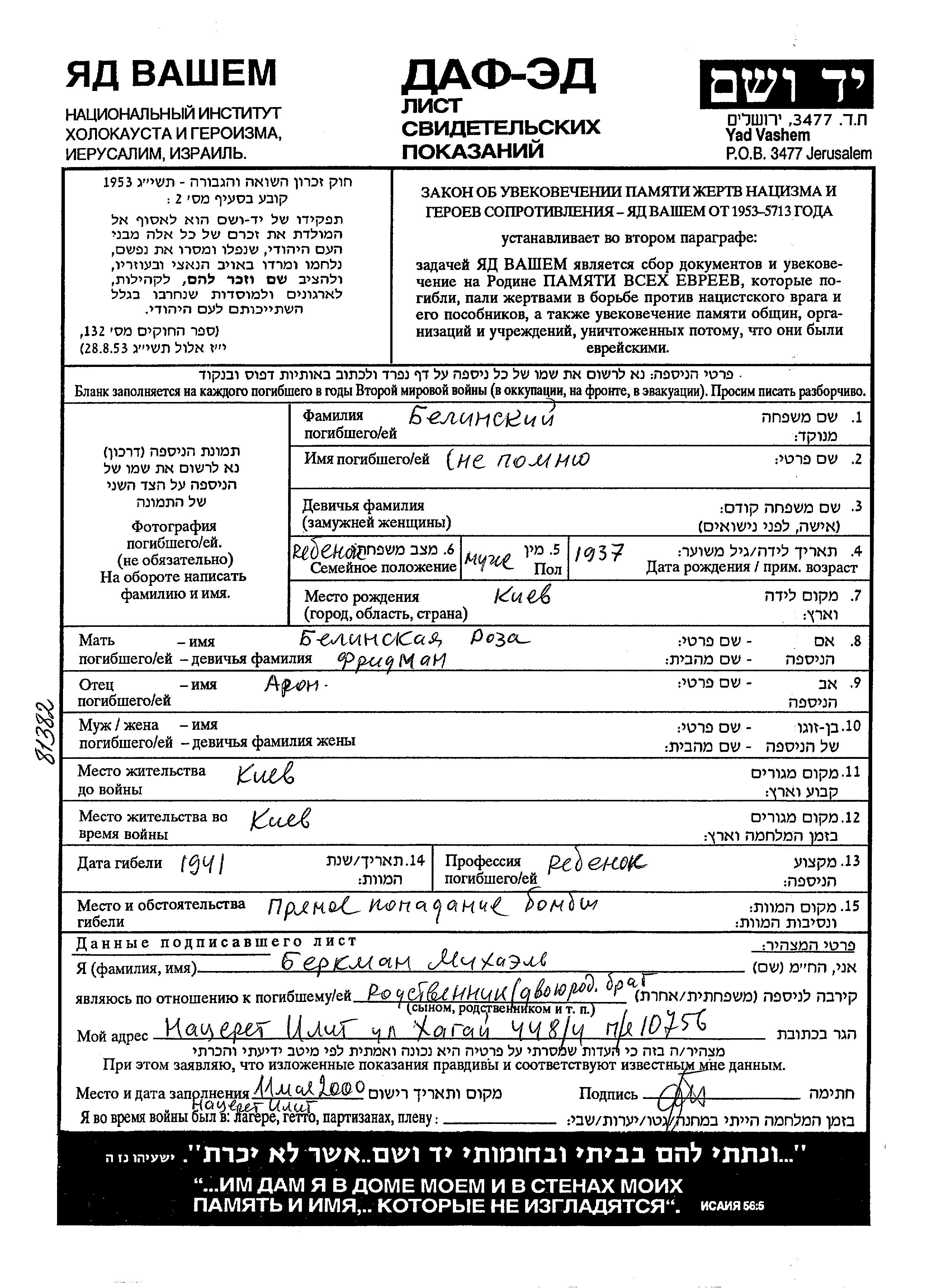 Vorname unbekannt Belinski wurde im Jahr 1937 in Kiyev, Ukraine (UdSSR) geboren. Er war der Sohn von Aron und Roza. Er war Kind. Vor dem Zweiten Weltkrieg lebte er in Kiyev, Ukraine (UdSSR). Während des Krieges war er in Kiyev, Ukraine (UdSSR).