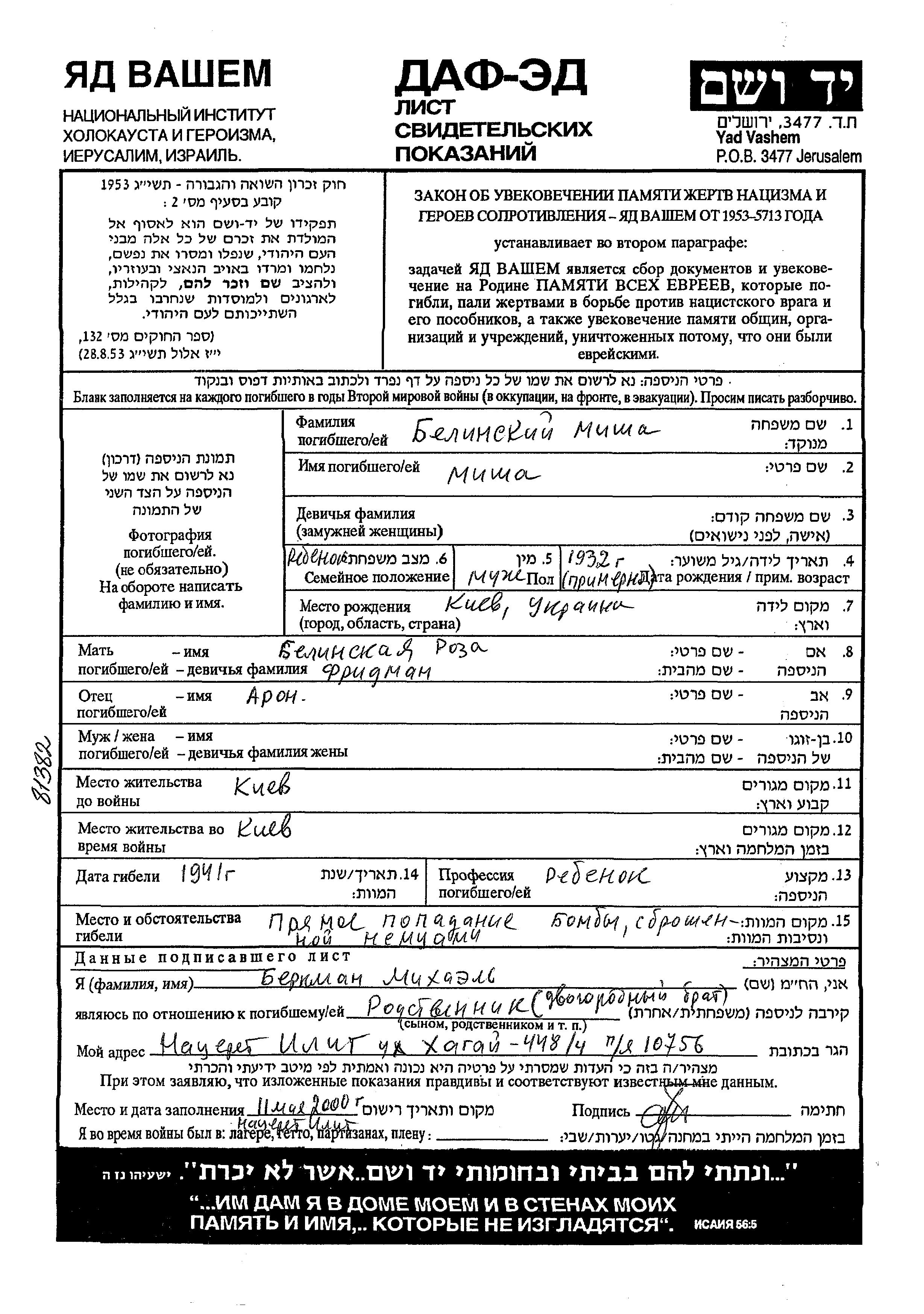 Belinski Misha 1932 Kiev, Ukraine (UdSSR) Gedenkblatt