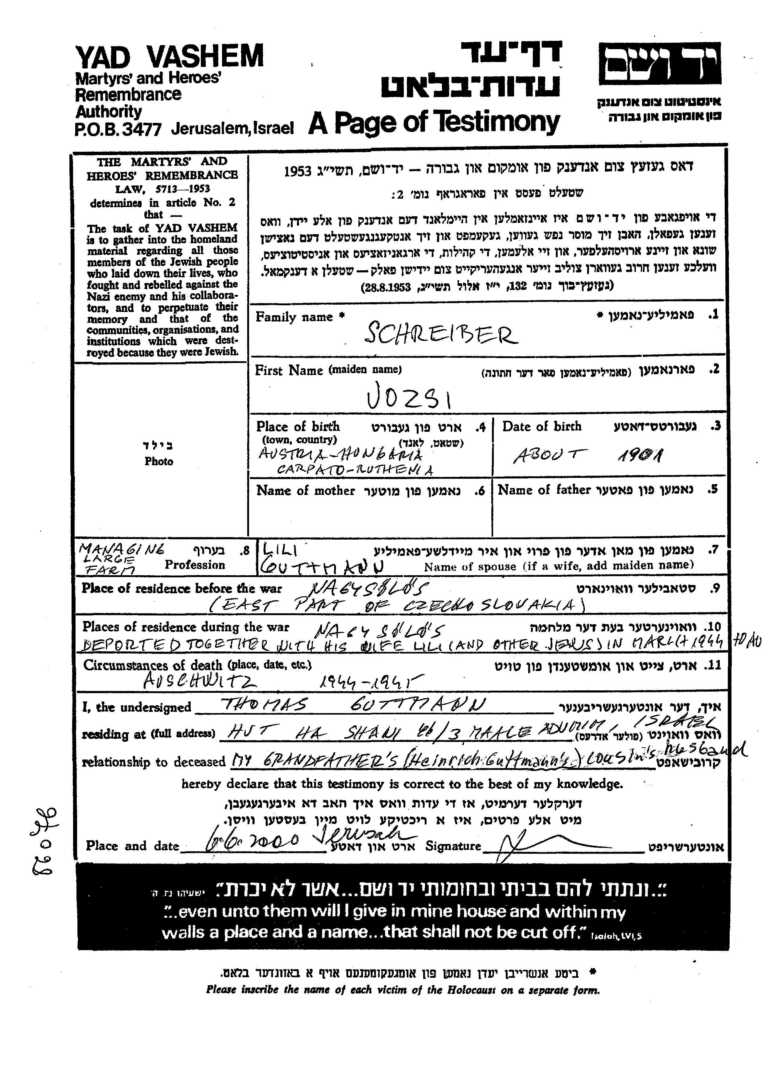 Jozsi Schreiber wurde im Jahr 1901 in Carpathian Ruthenia, Tschechoslowakei geboren. Vor dem Zweiten Weltkrieg lebte er in Nagysalo, Tschechoslowakei. Während des Krieges war er in Nagysallo, Tschechoslowakei.