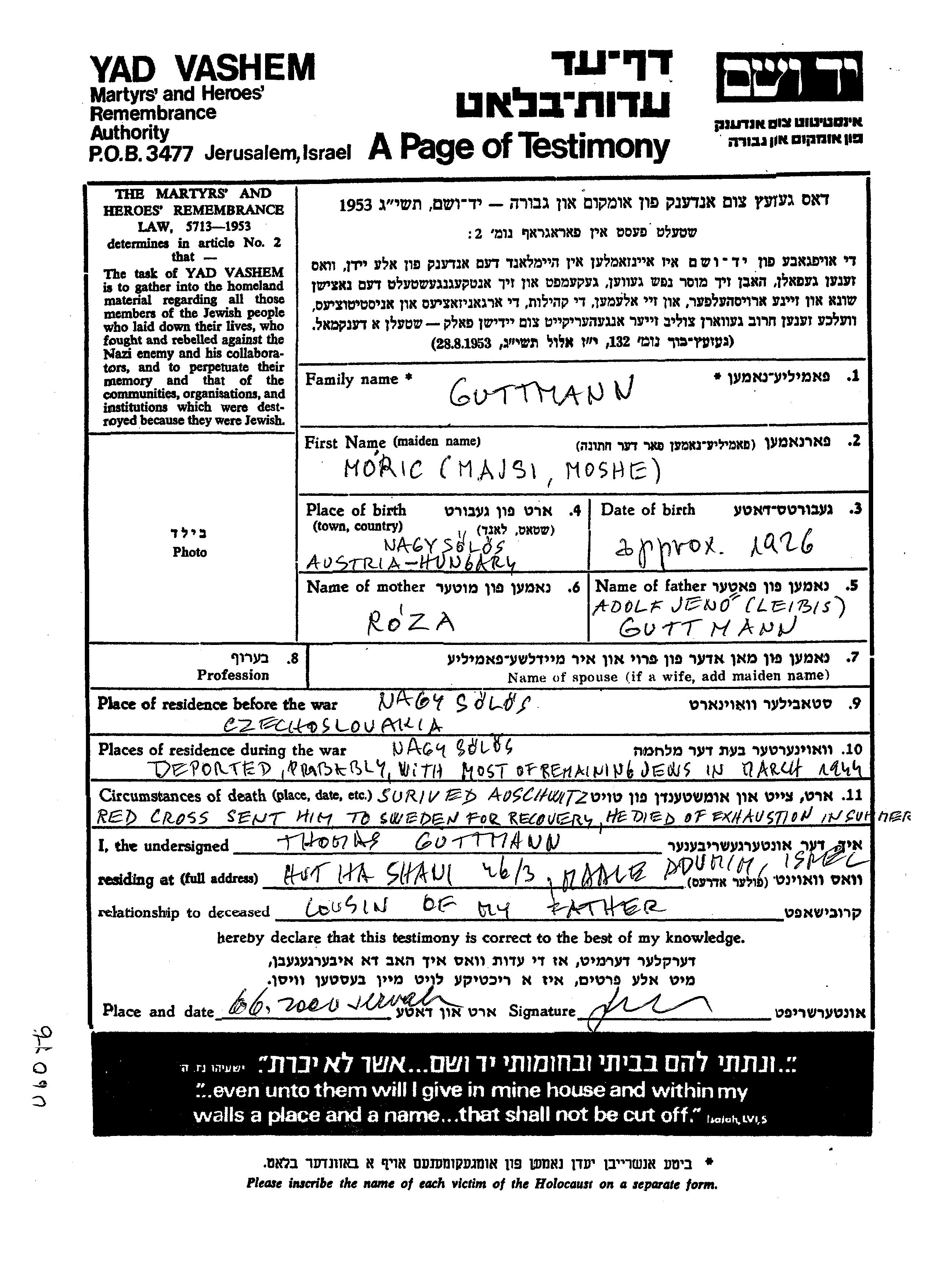 Moric Majsi Guttmann wurde im Jahr 1926 in Nagyszollos, Tschechoslowakei geboren. Er war der Sohn von Adolf Jeno und Roza. Vor dem Zweiten Weltkrieg lebte er in Nagyszollos, Tschechoslowakei. Während des Krieges war er in Nagyszollos, Tschechoslowakei.