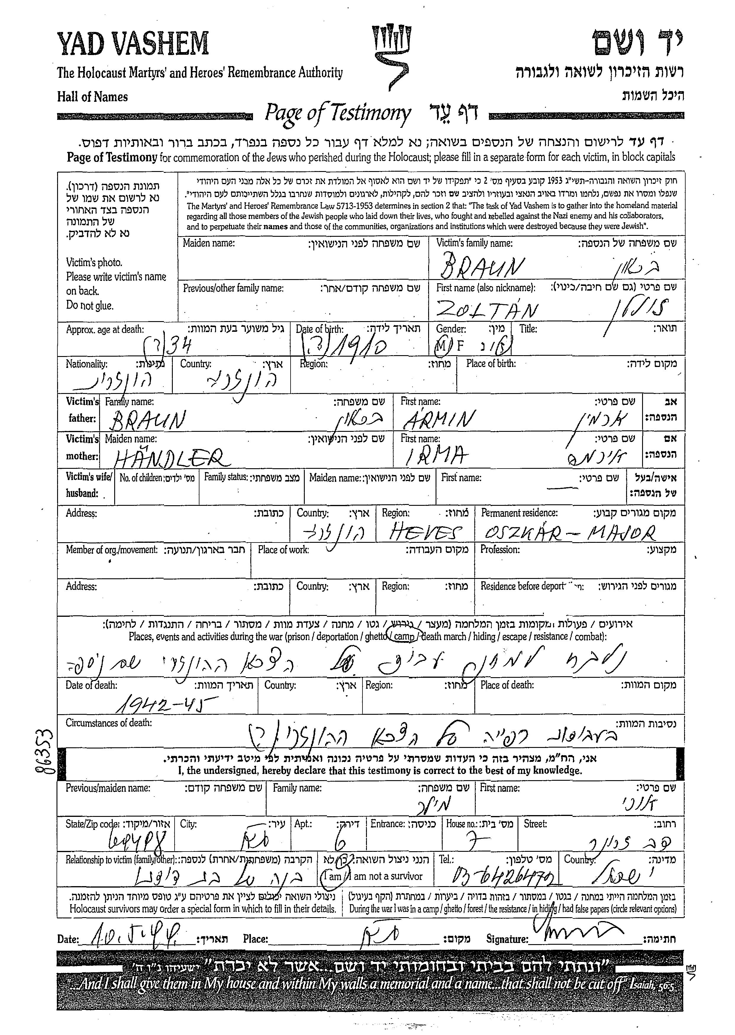 Zoltan Braun wurde im Jahr 1910 in Ungarn geboren. Er war der Sohn von Armin und Irma. Vor dem Zweiten Weltkrieg lebte er in Heves, Ungarn. Während des Krieges war er in Zwangsarbeit Bataillone MUSZ in die Ungarischen Streitkräfte.