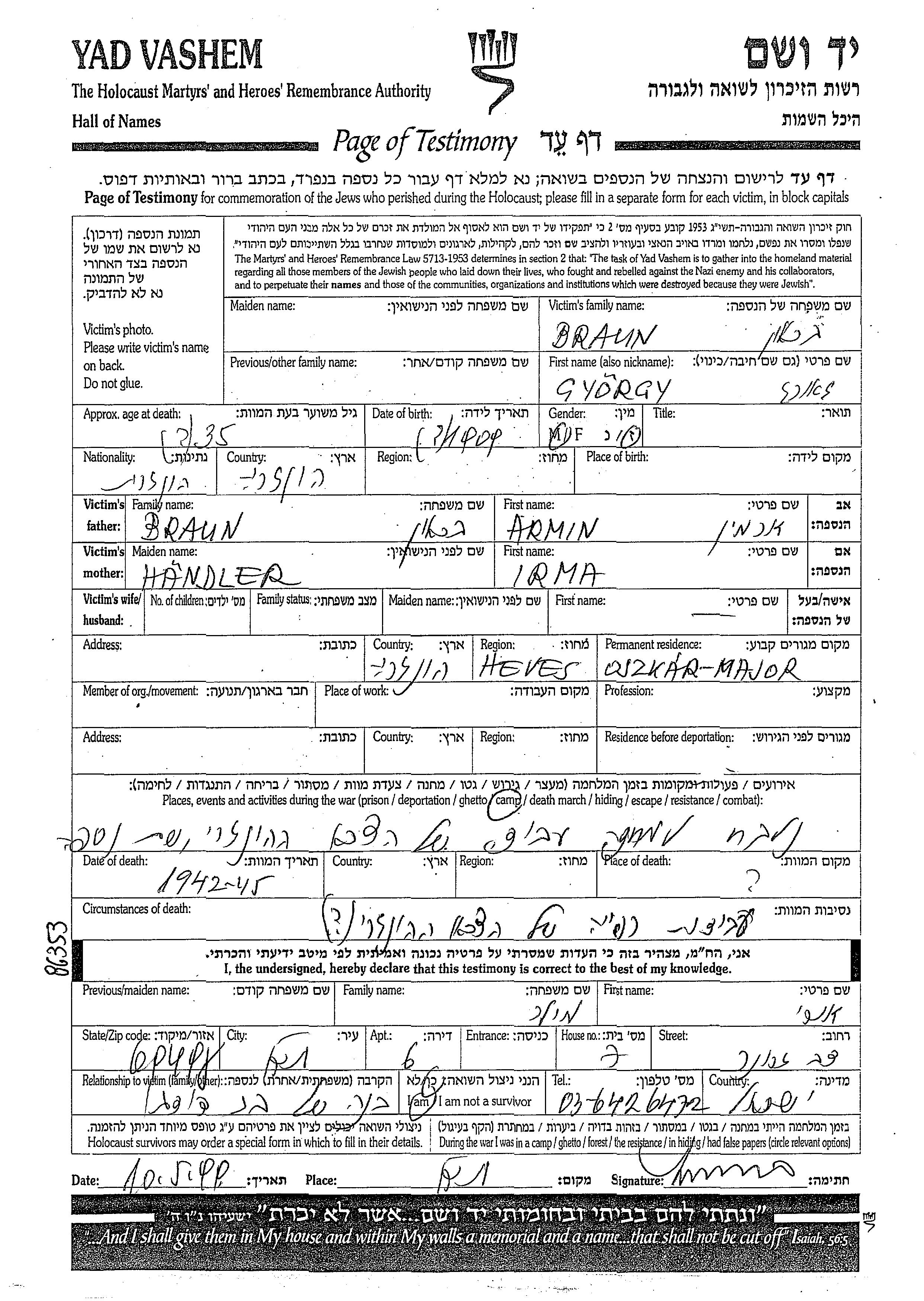 Gyorgy Braun wurde im Jahr 1909 in Ungarn geboren. Er war der Sohn von Armin und Irma. Vor dem Zweiten Weltkrieg lebte er in Major, Ungarn. Während des Krieges war er in Zwangsarbeit Bataillone MUSZ in die Ungarischen Streitkräfte.