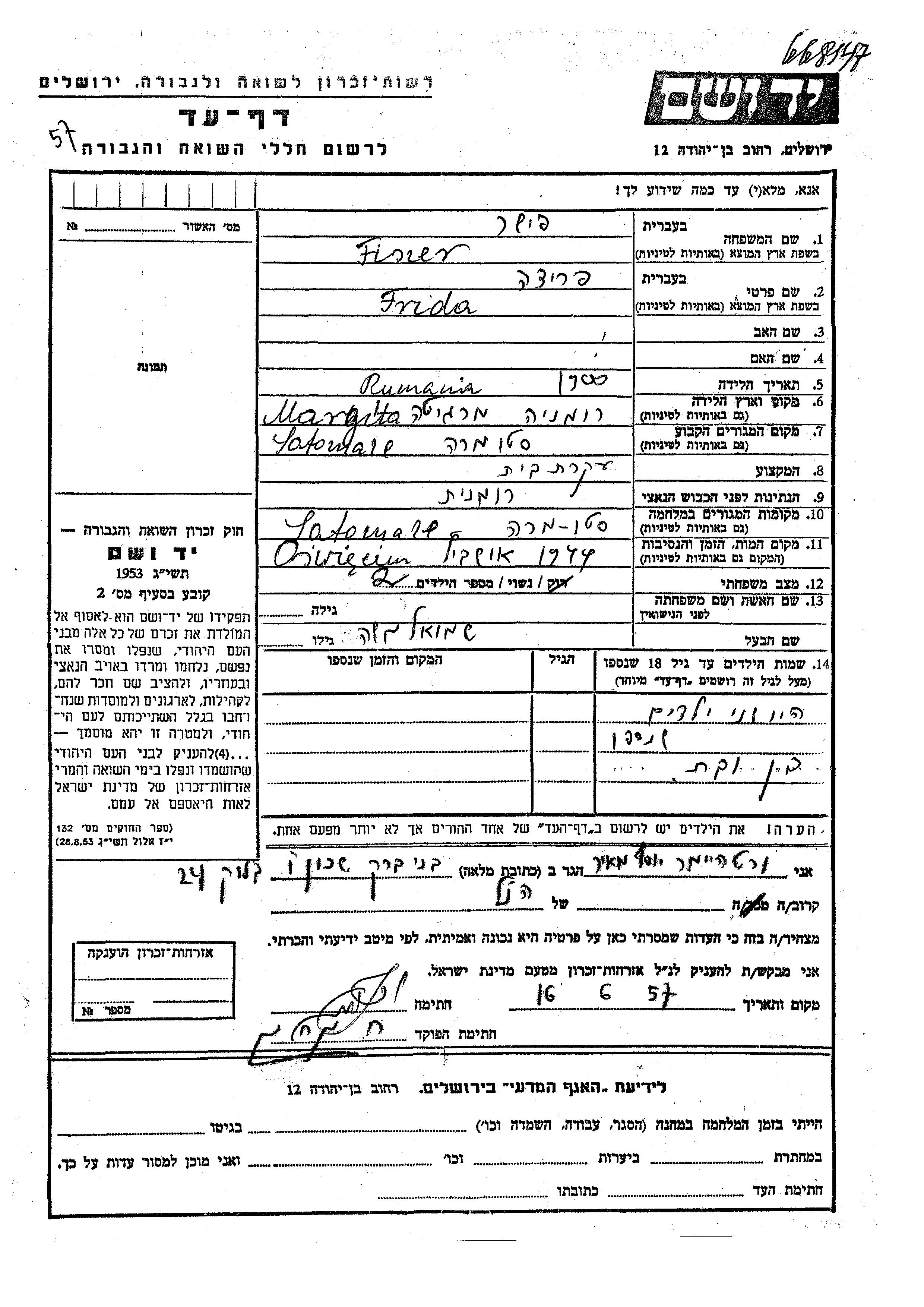 Frida Fiszer wurde im Jahr 1900 in Margita, Rumänien geboren. Sie war Hausfrau und mit Shmuel Moshe Verheiratet. Vor dem Zweiten Weltkrieg lebte sie in Satomare, Rumänien. Während des Krieges war sie in Satomare, Rumänien.