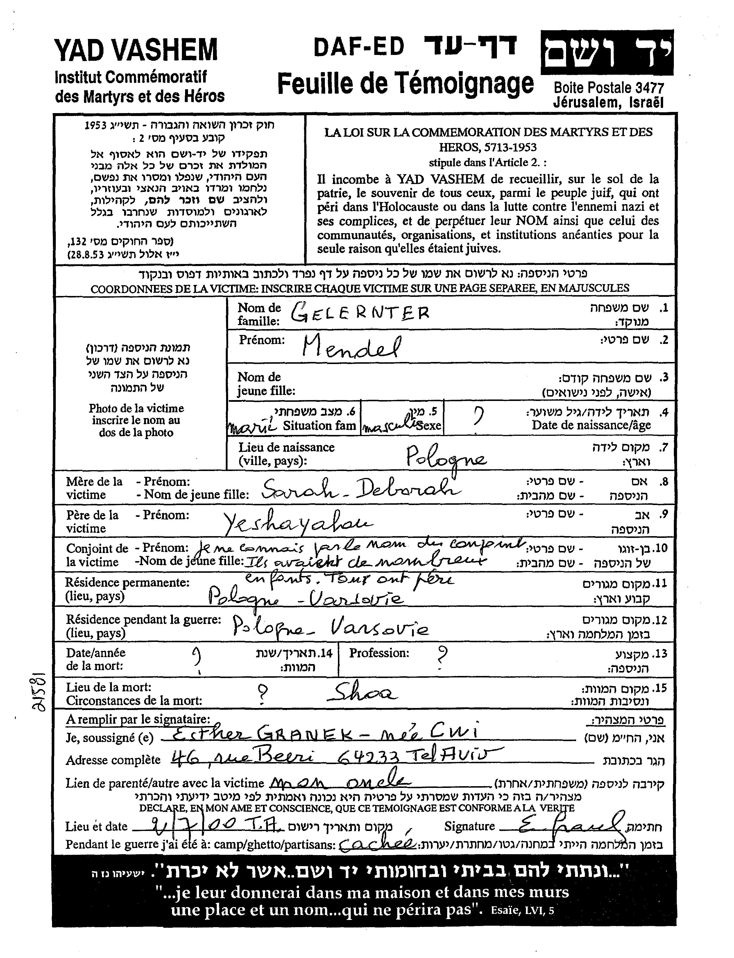Mendel Gelernter wurde in Polen geboren. Er war der Sohn von Yeshayahu und Sarah Deborah. Er war Verheiratet. Vor dem Zweiten Weltkrieg lebte er in Varsovie, Polen. Während des Krieges war er in Varsovie, Polen.