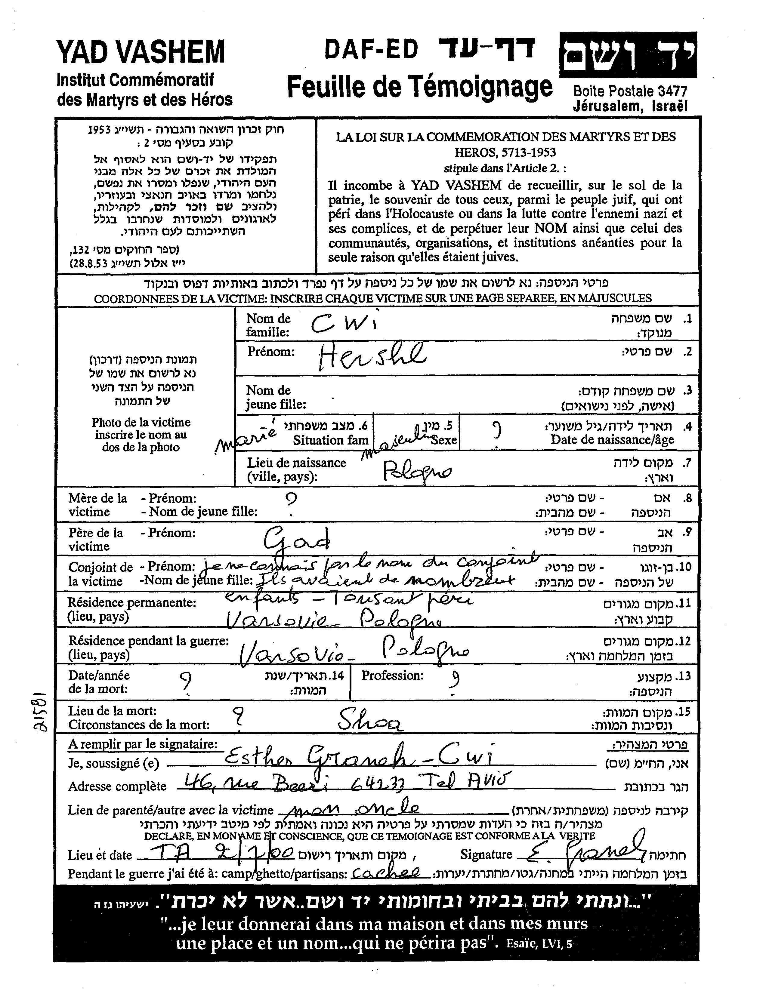 Hershl Cwi wurde in Polen geboren. Er war der Sohn von Gad. Er war Verheiratet. Vor dem Zweiten Weltkrieg lebte er in Warszawa, Polen. Während des Krieges war er in Warszawa, Polen.