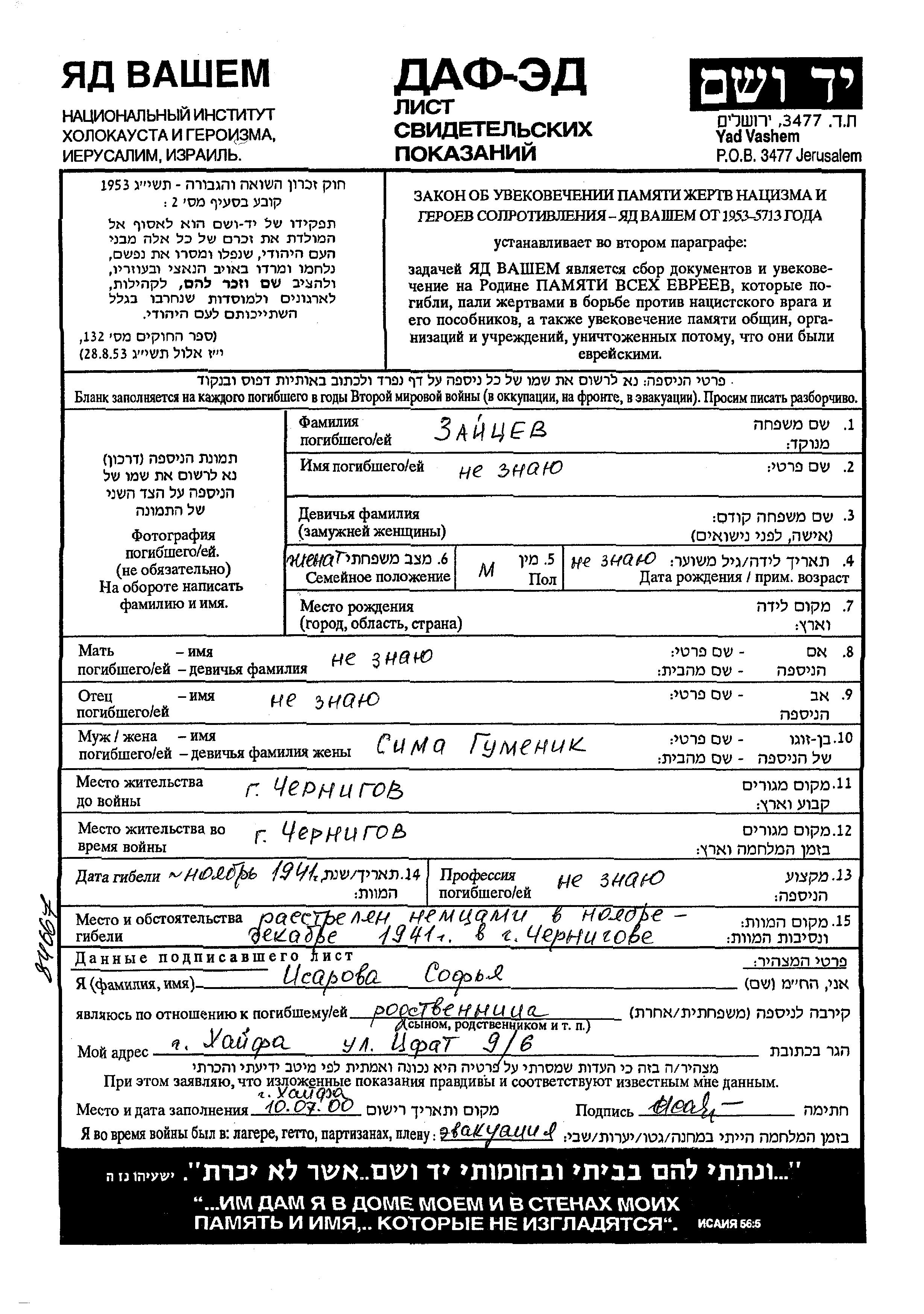 Vorname unbekannt Zaitzev. Er war mit Sima Verheiratet. Vor dem Zweiten Weltkrieg lebte er in Chernigov, Ukraine (UdSSR). Während des Krieges war er in Chernigov, Ukraine (UdSSR).