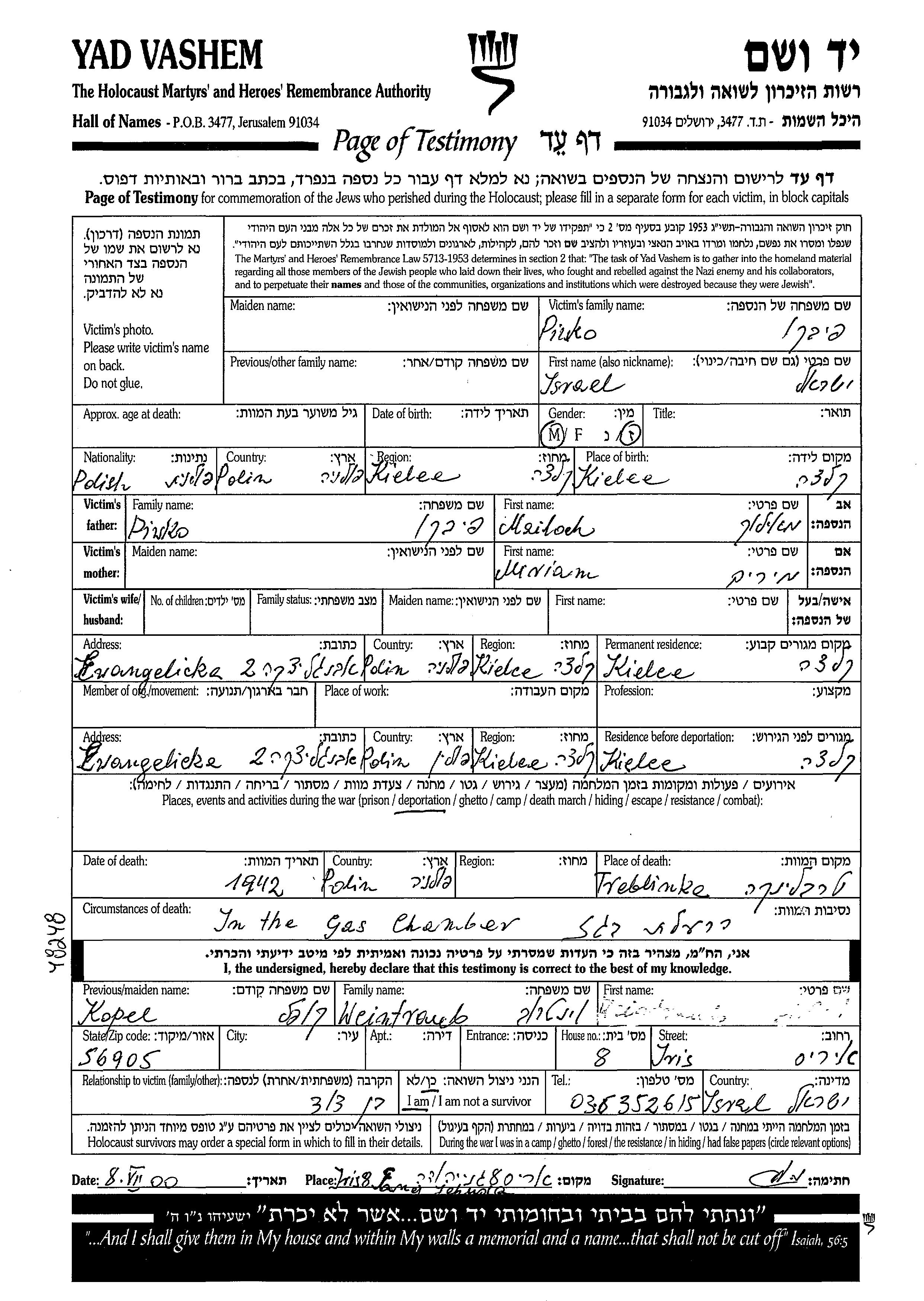 Israel wurde in der Schoah ermordet. Todesort: Treblinka, Polen im Jahr 1942.