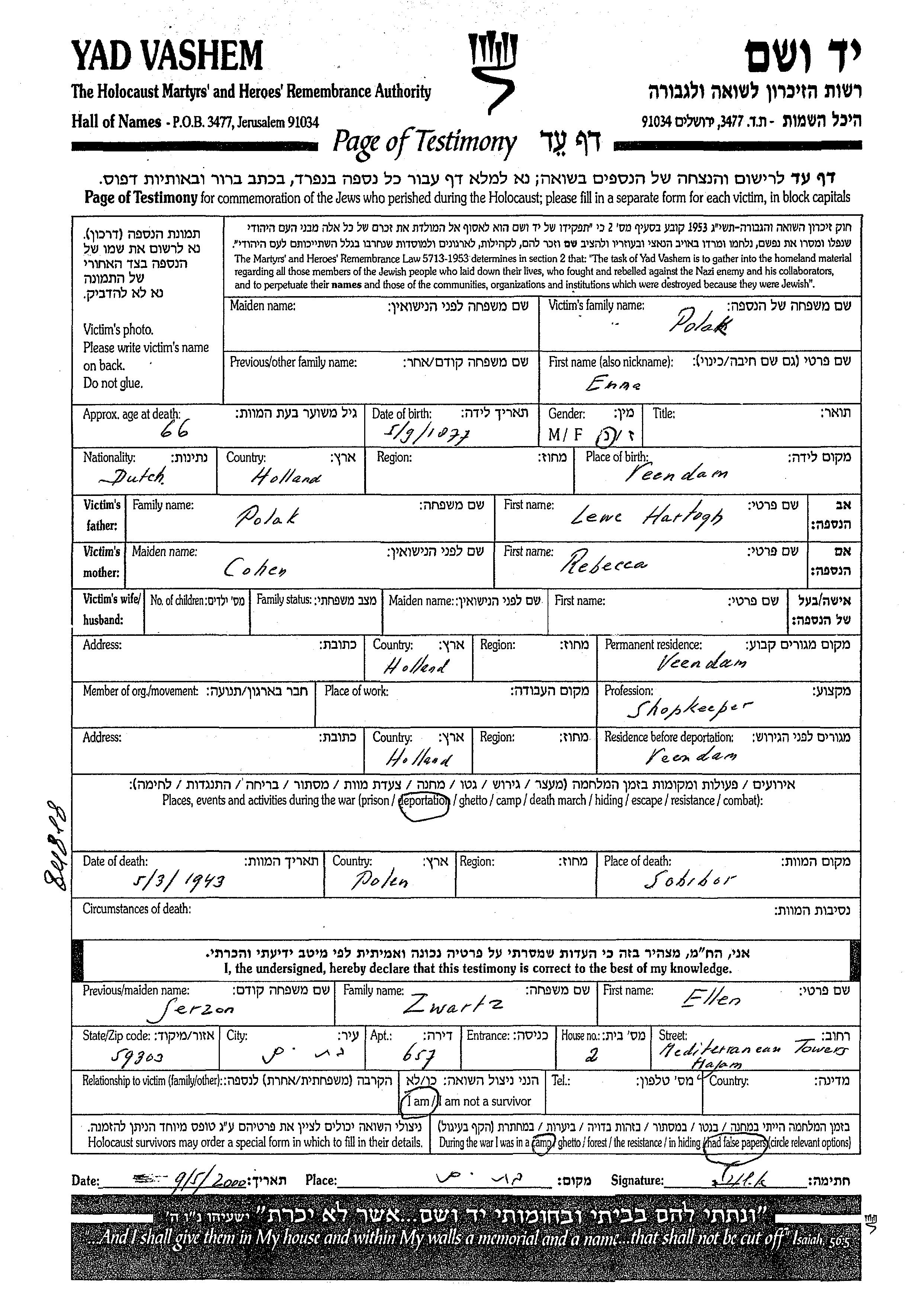Emma Polak wurde im Jahr 1877 in Veendam, Niederlande geboren. Sie war die Tochter von Lewe Hartogh und Rebecca. Sie war Ladenbesitzer/-in. Vor dem Zweiten Weltkrieg lebte sie in Veendam, Niederlande. Während des Krieges war sie in Veendam, Niederlande.