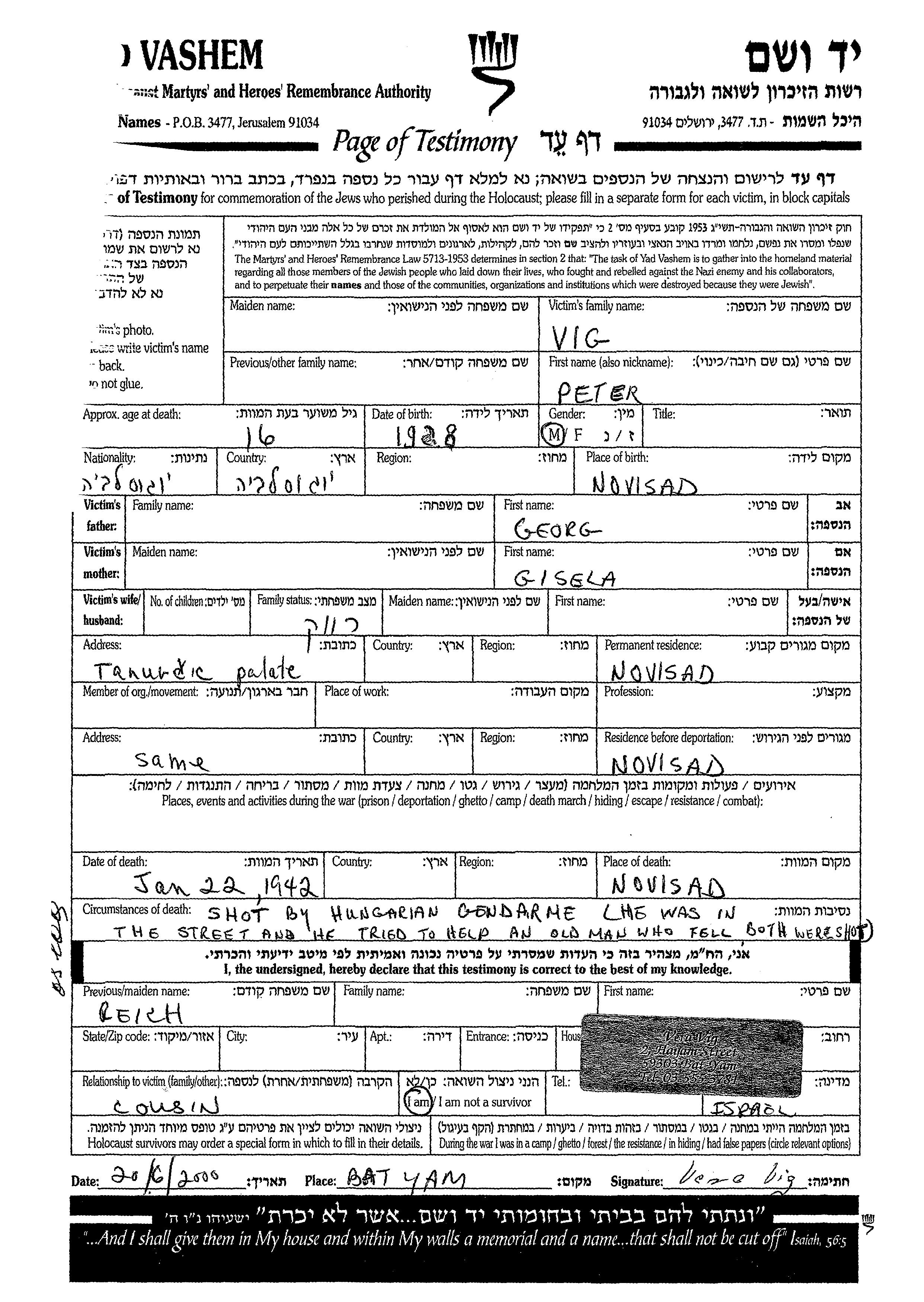 Peter wurde in der Schoah ermordet. Todesort: Novisad, Jugoslawien im Jahr 1942.