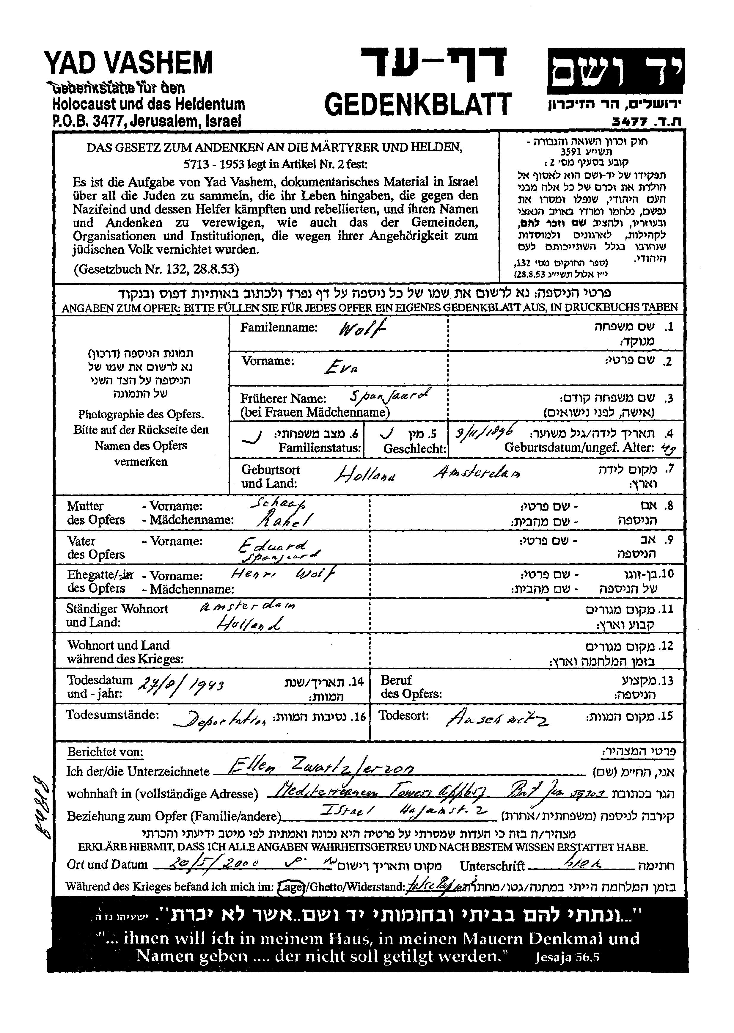 Eva Wolf, geb. Spanjaard wurde im Jahr 1896 in Amsterdam, Niederlande geboren. Sie war die Tochter von Eduard und Rahel. Sie war mit Henri Verheiratet. Vor dem Zweiten Weltkrieg lebte sie in Amsterdam, Niederlande.