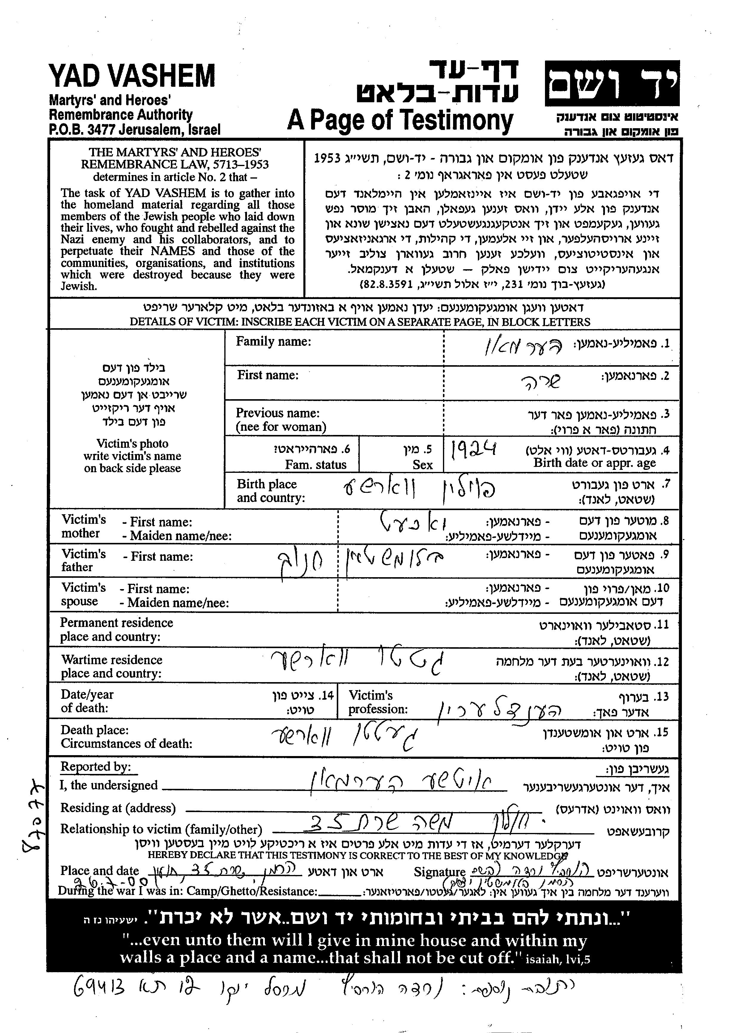 Sara wurde in der Schoah ermordet. Todesort: Warszawa, Polen.