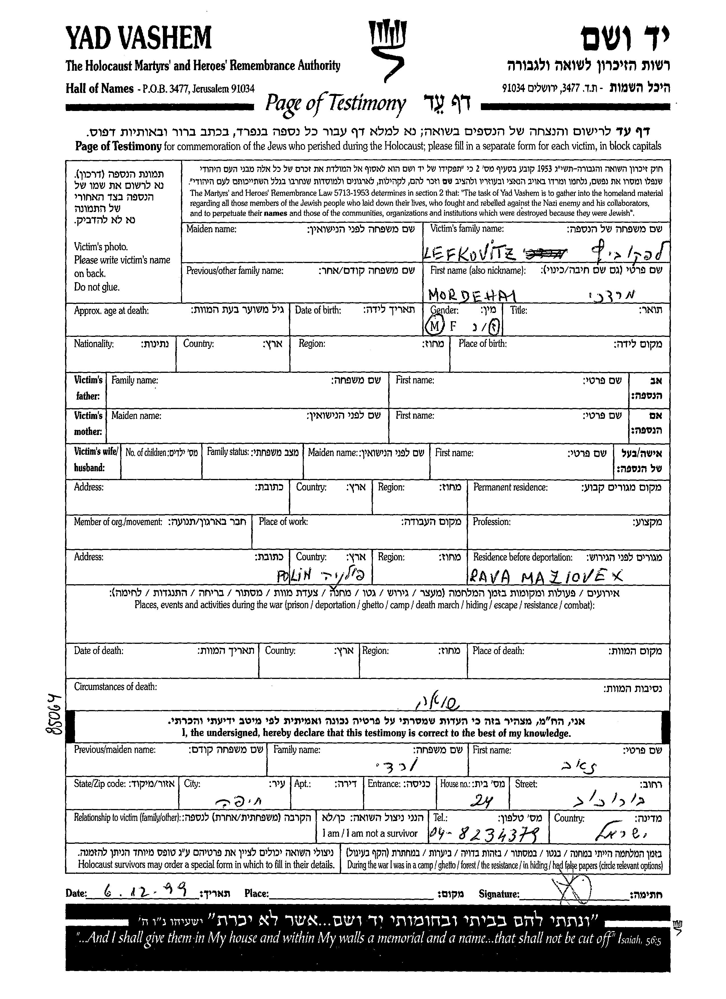 Mordehai wurde in der Schoah ermordet.