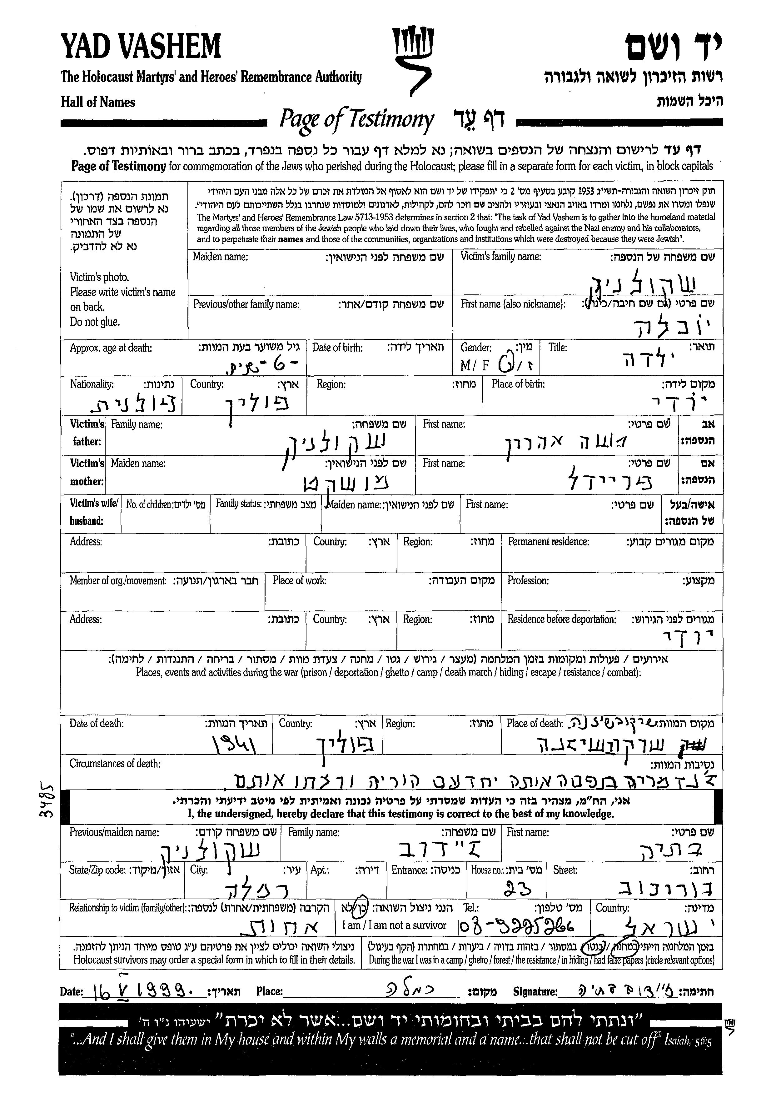 Iokhale Shkolnik wurde in Jod, Polen geboren. Sie war die Tochter von Moshe Aharon und Freidel. Während des Krieges war sie in Jod, Polen.