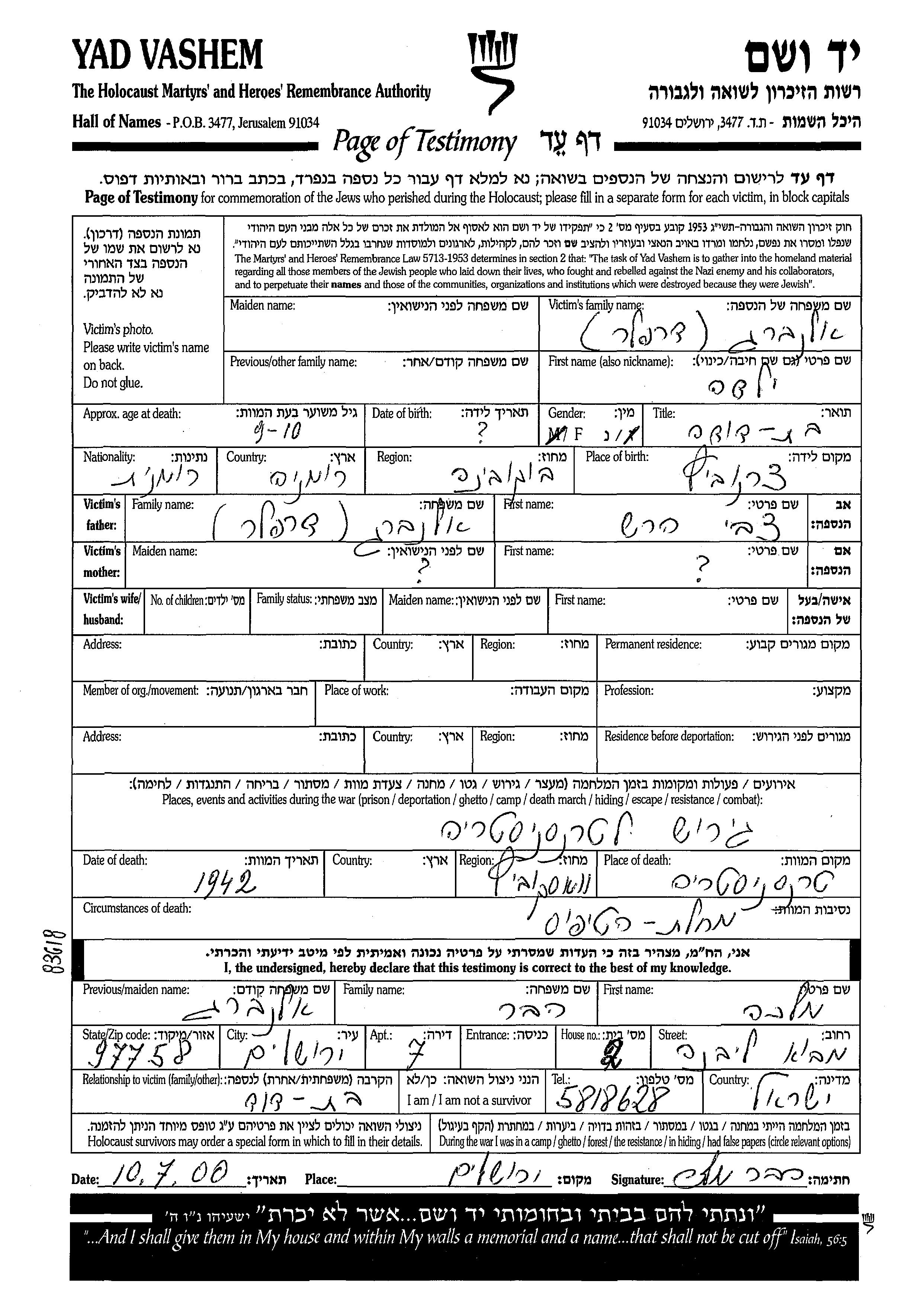 Er wurde in der Schoah ermordet. Todesort: Vaskovichi, Ukraine (UdSSR) im Jahr 1942.