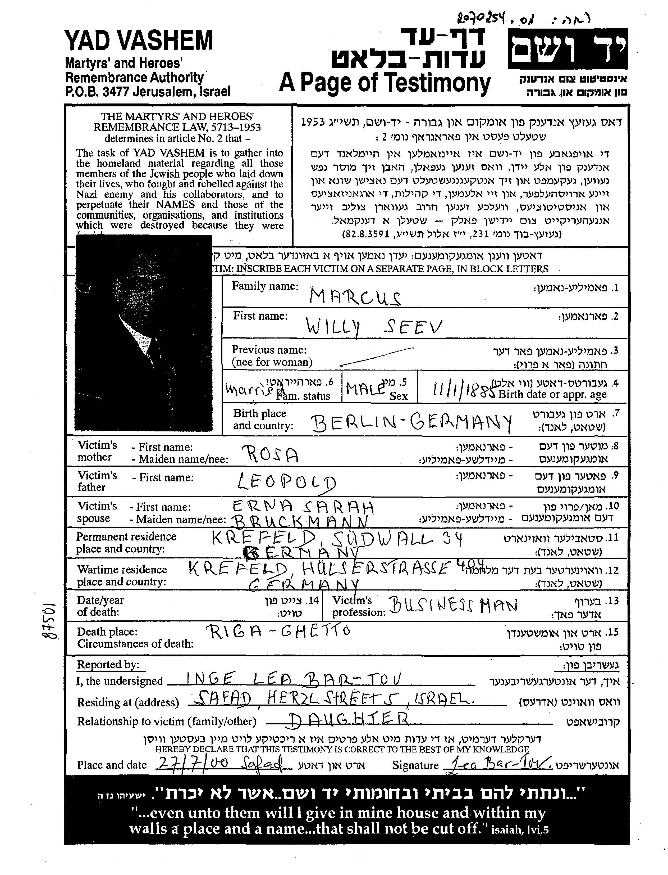 Willy Seev Marcus wurde im Jahr 1885 in Berlin, Deutsches Reich geboren. Er war der Sohn von Leopold und Rosa. Er war Geschäftsmann und mit Erna Sarah, geb. Bruckmann Verheiratet. Vor dem Zweiten Weltkrieg lebte er in Krefeld, Deutsches Reich. Während des Krieges war er in Krefeld, Deutsches Reich.