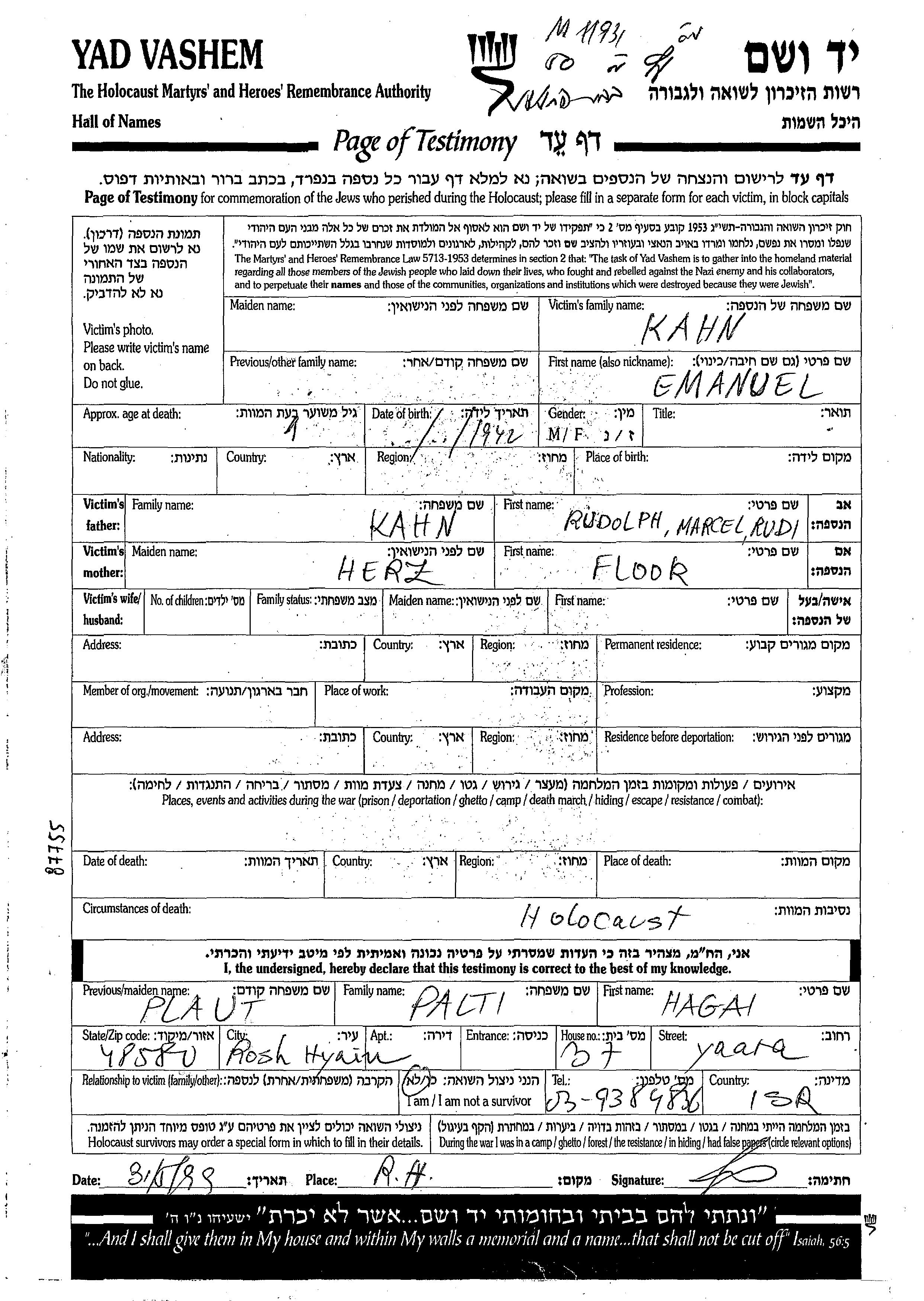 Kahn Emanuel 1942 unbekannter Ort, Gedenkblatt