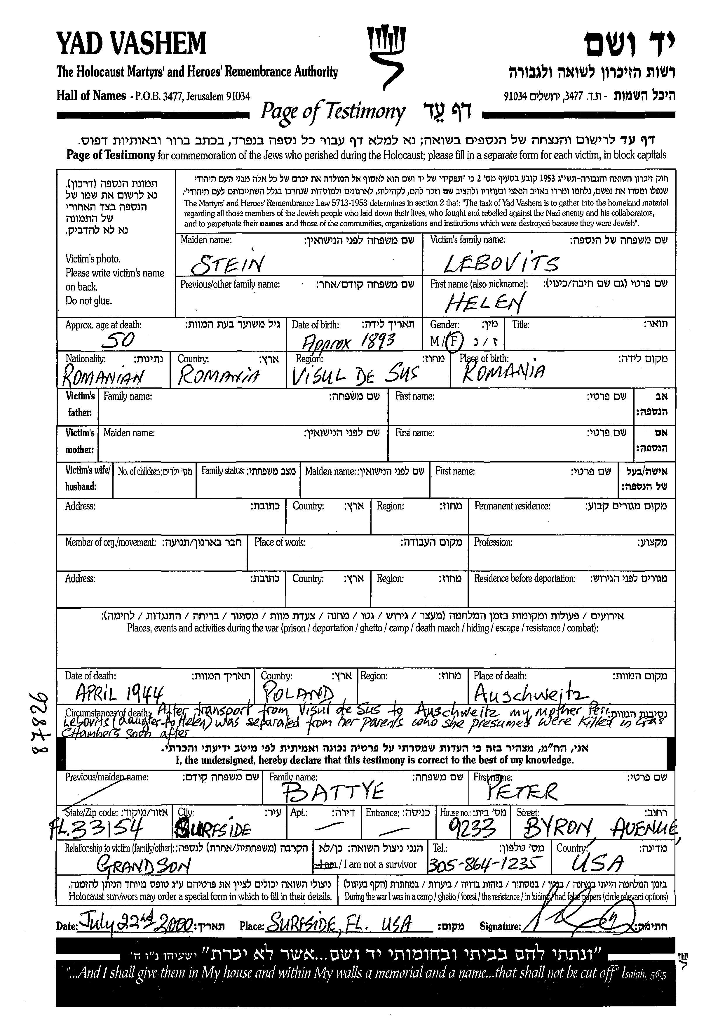 Helen Lebovits, geb. Stein wurde im Jahr 1893 in Viseu de Sus, Rumänien geboren. Sie war Verheiratet. Vor dem Zweiten Weltkrieg lebte sie in Transylvania, Rumänien.