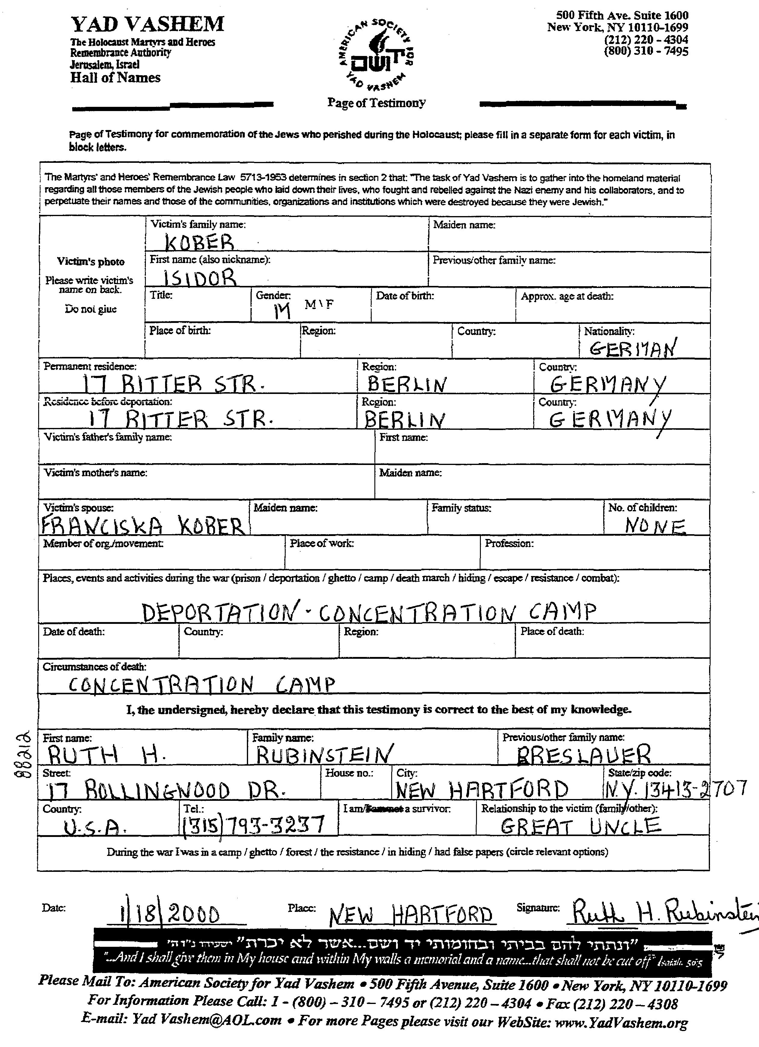 Isidor Kober. Er war mit Franciska Verheiratet. Vor dem Zweiten Weltkrieg lebte er in Berlin, Deutsches Reich. Während des Krieges war er in Berlin, Deutsches Reich.