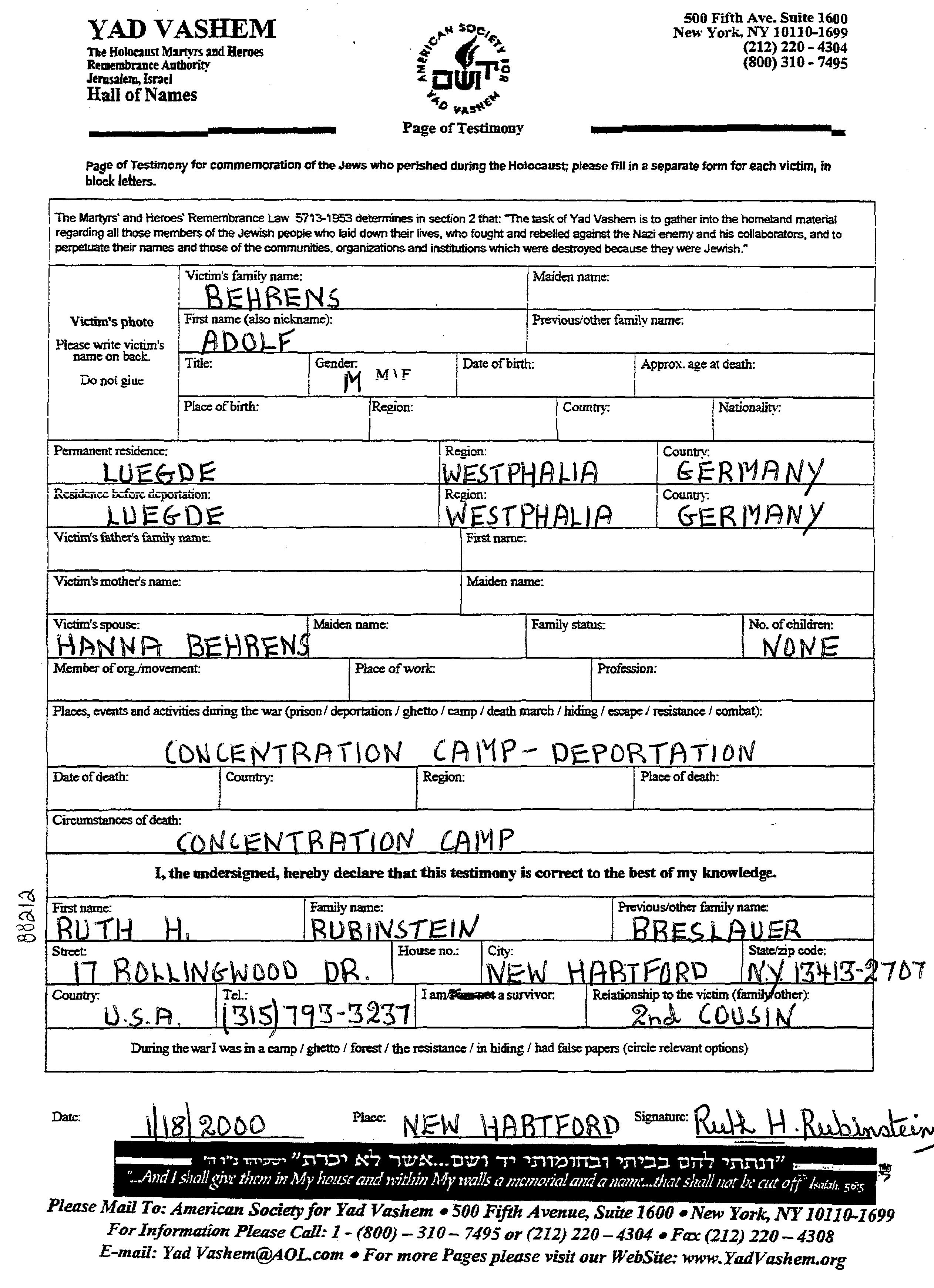 Adolf Behrens. Er war mit Hanna Verheiratet. Vor dem Zweiten Weltkrieg lebte er in Luegde, Deutsches Reich. Während des Krieges war er in Luegde, Deutsches Reich.