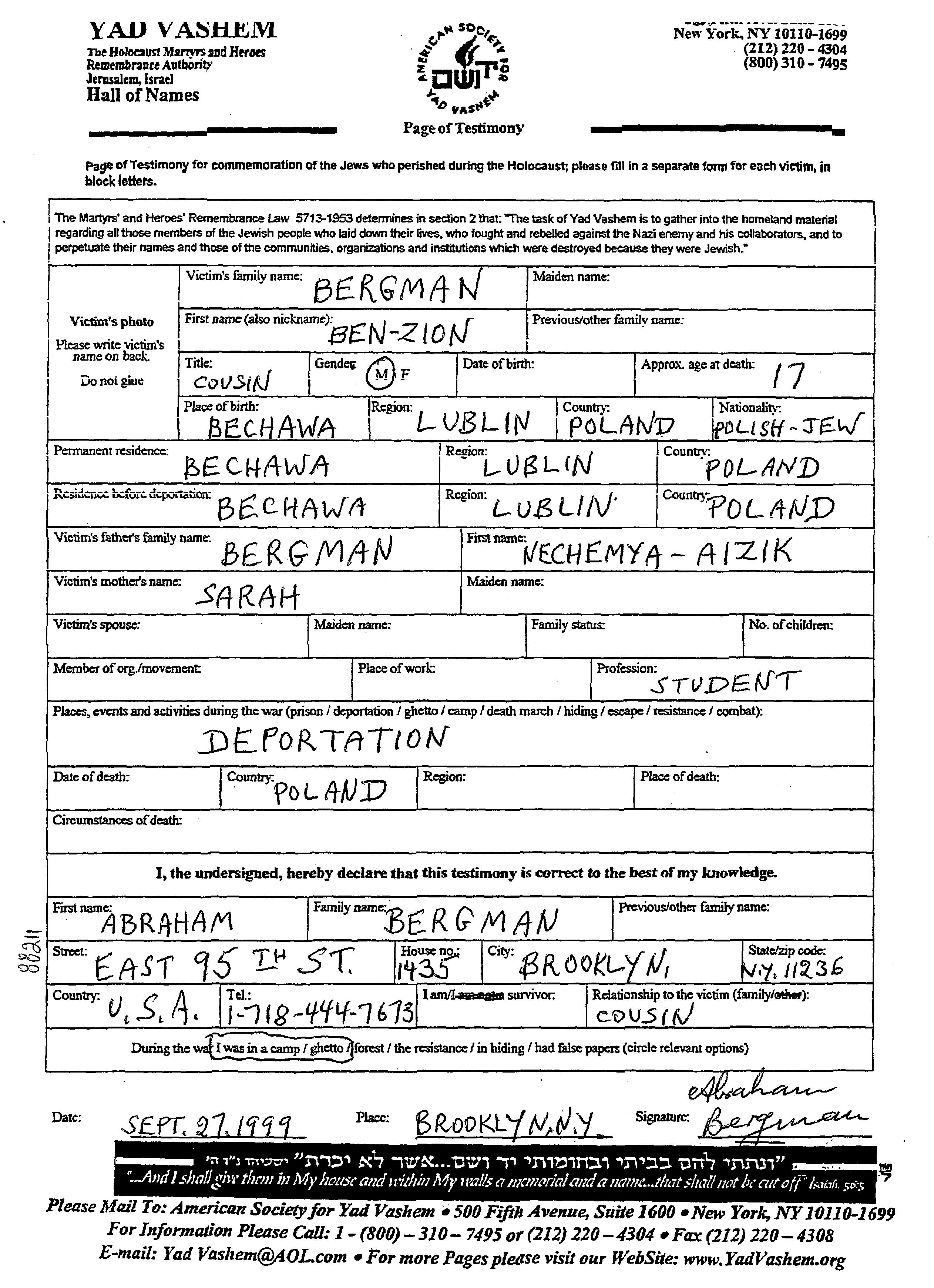 Ben Zion Bergman wurde in Bechawa, Polen geboren. Er war der Sohn von Nechemya Aizik und Sarah. Er war Student. Vor dem Zweiten Weltkrieg lebte er in Bechawa, Polen. Während des Krieges war er in Bechawa, Polen.