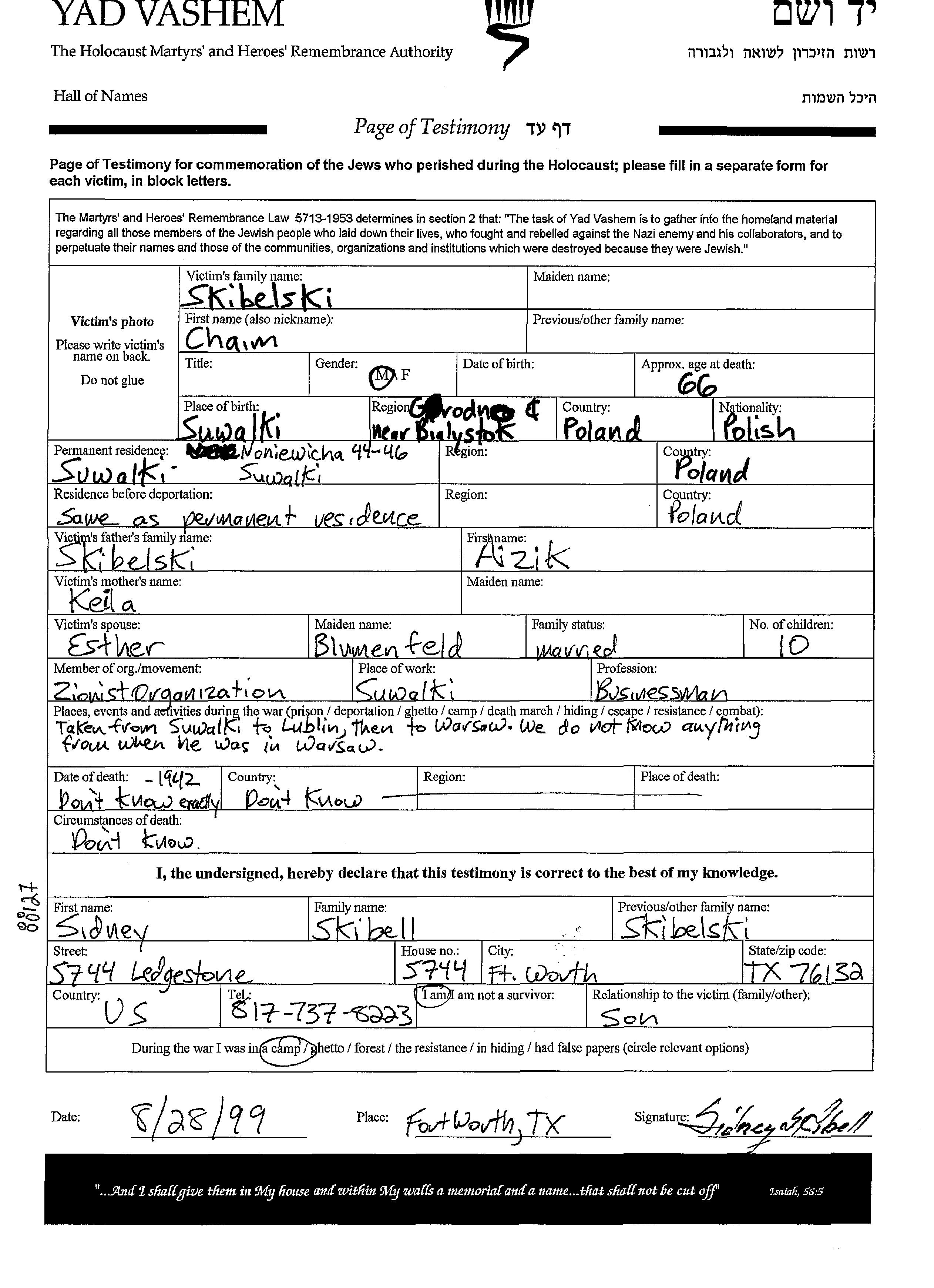 Chaim Skibelski wurde in Suwalki, Polen geboren. Er war der Sohn von Aizik und Keila. Er war Geschäftsmann und mit Esther, geb. Blumenfeld Verheiratet. Vor dem Zweiten Weltkrieg lebte er in Suwalki, Polen. Während des Krieges war er in Suwalki, Polen.