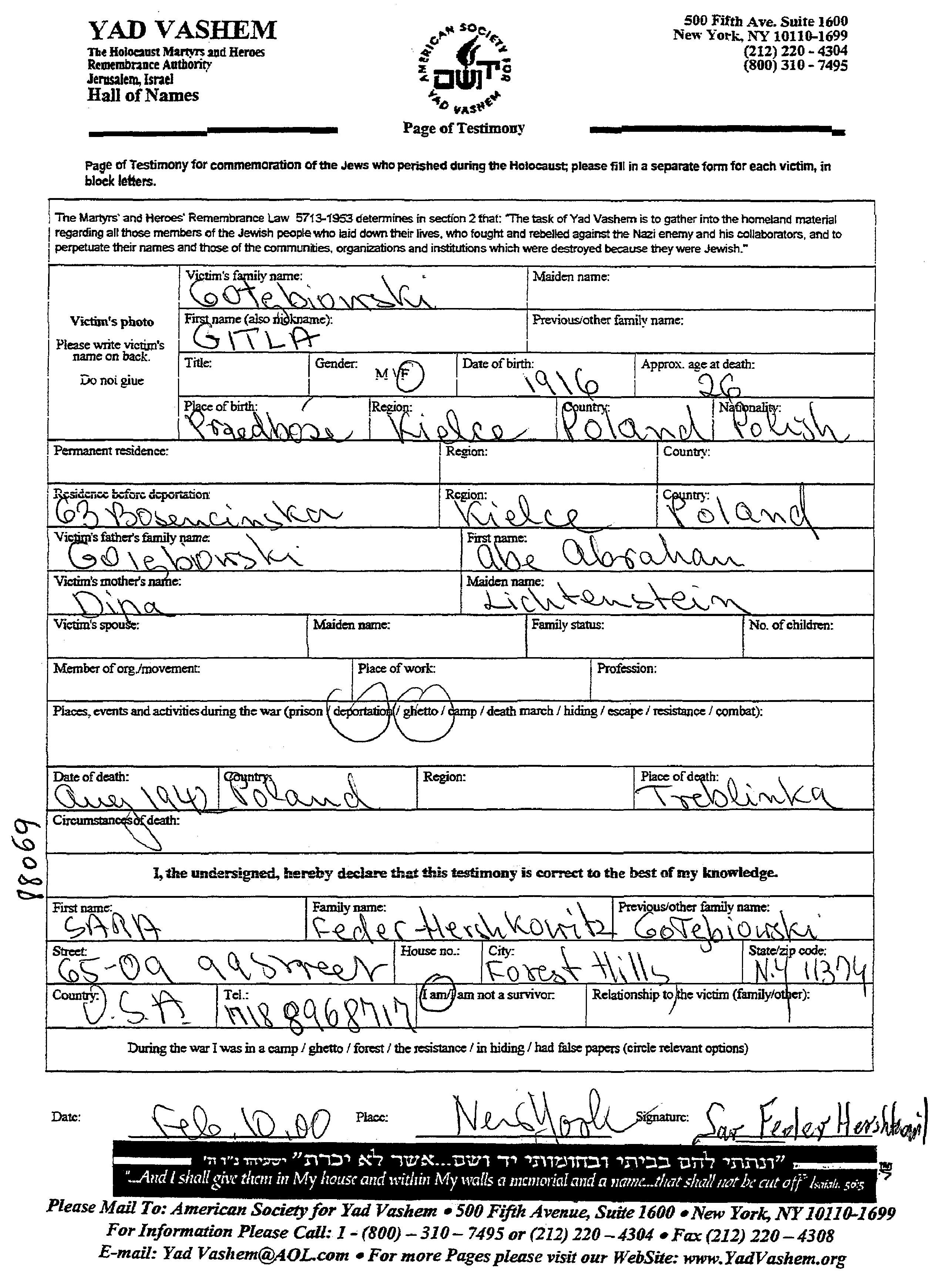 Gitla wurde in der Schoah ermordet. Todesort: Treblinka, Polen im Jahr 1942.