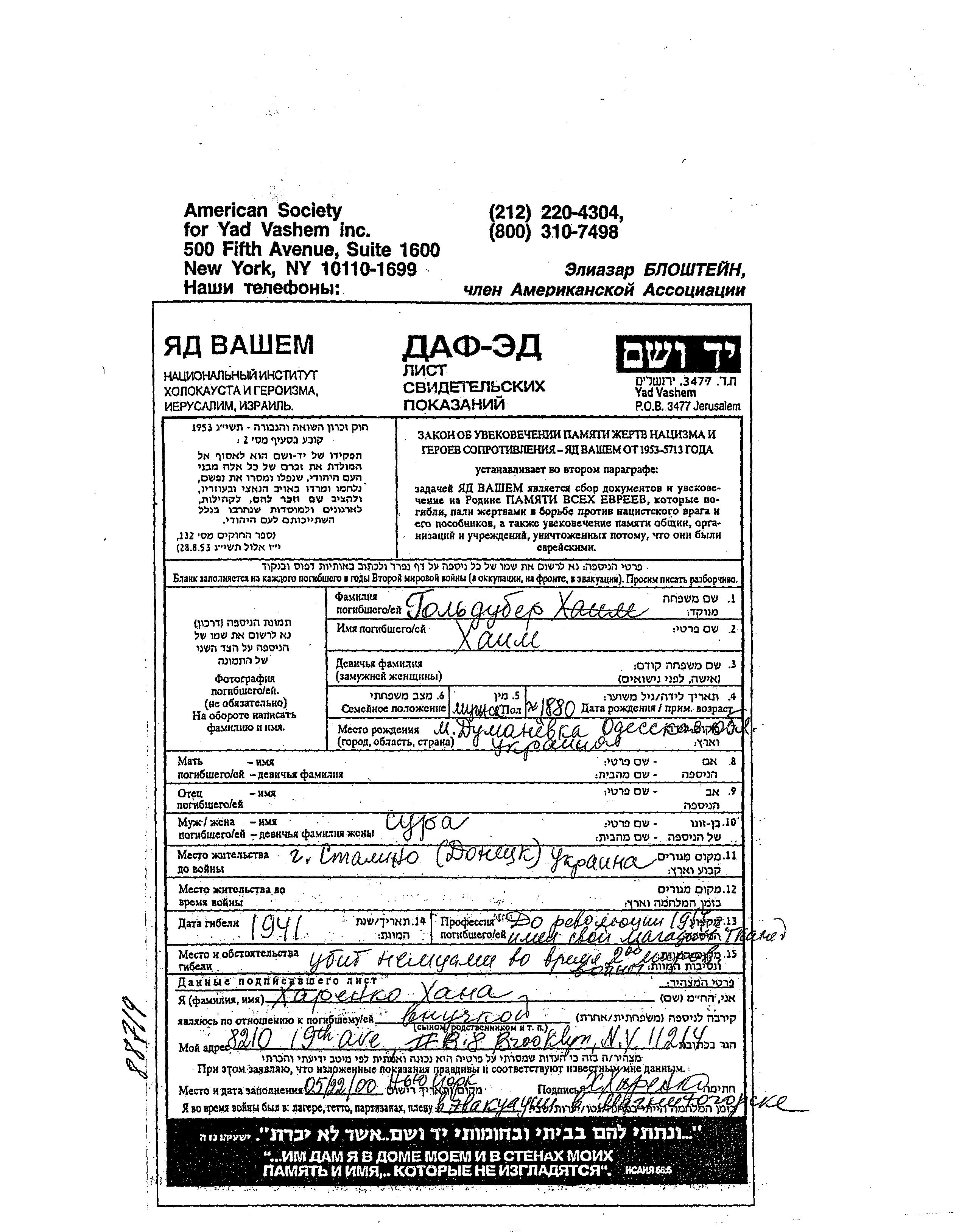 Golduber Khaim 1880 Stalino, Ukraine (UdSSR) Gedenkblatt