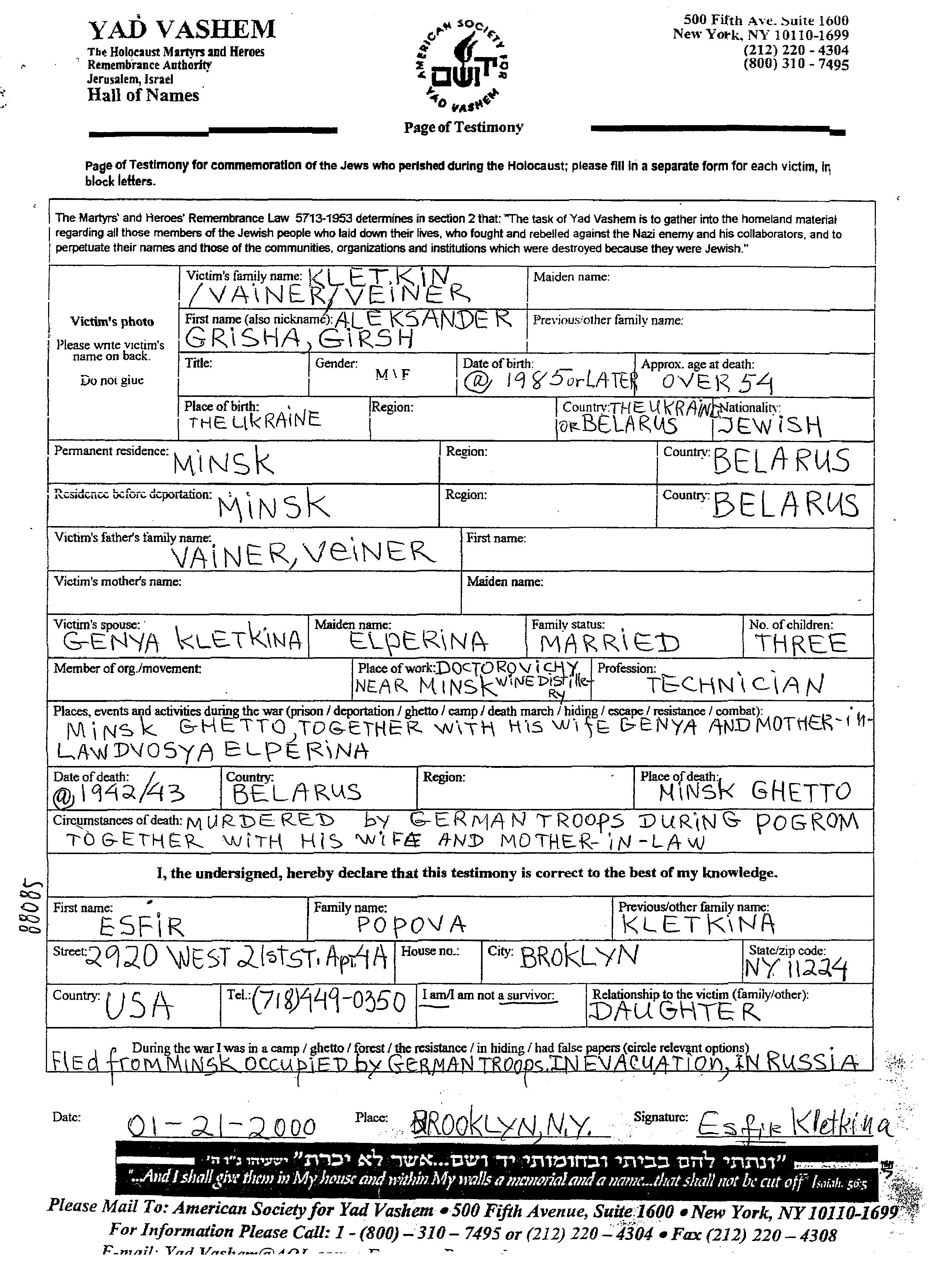 Grisha Hirsh Aleksander Kletkin Vainer wurde im Jahr 1885 in Ukraine (UdSSR) geboren. Er war Techniker/-in und mit Genya, geb. Elperina Verheiratet. Vor dem Zweiten Weltkrieg lebte er in Minsk, Weißrussland (UdSSR). Während des Krieges war er in Minsk, Weißrussland (UdSSR).
