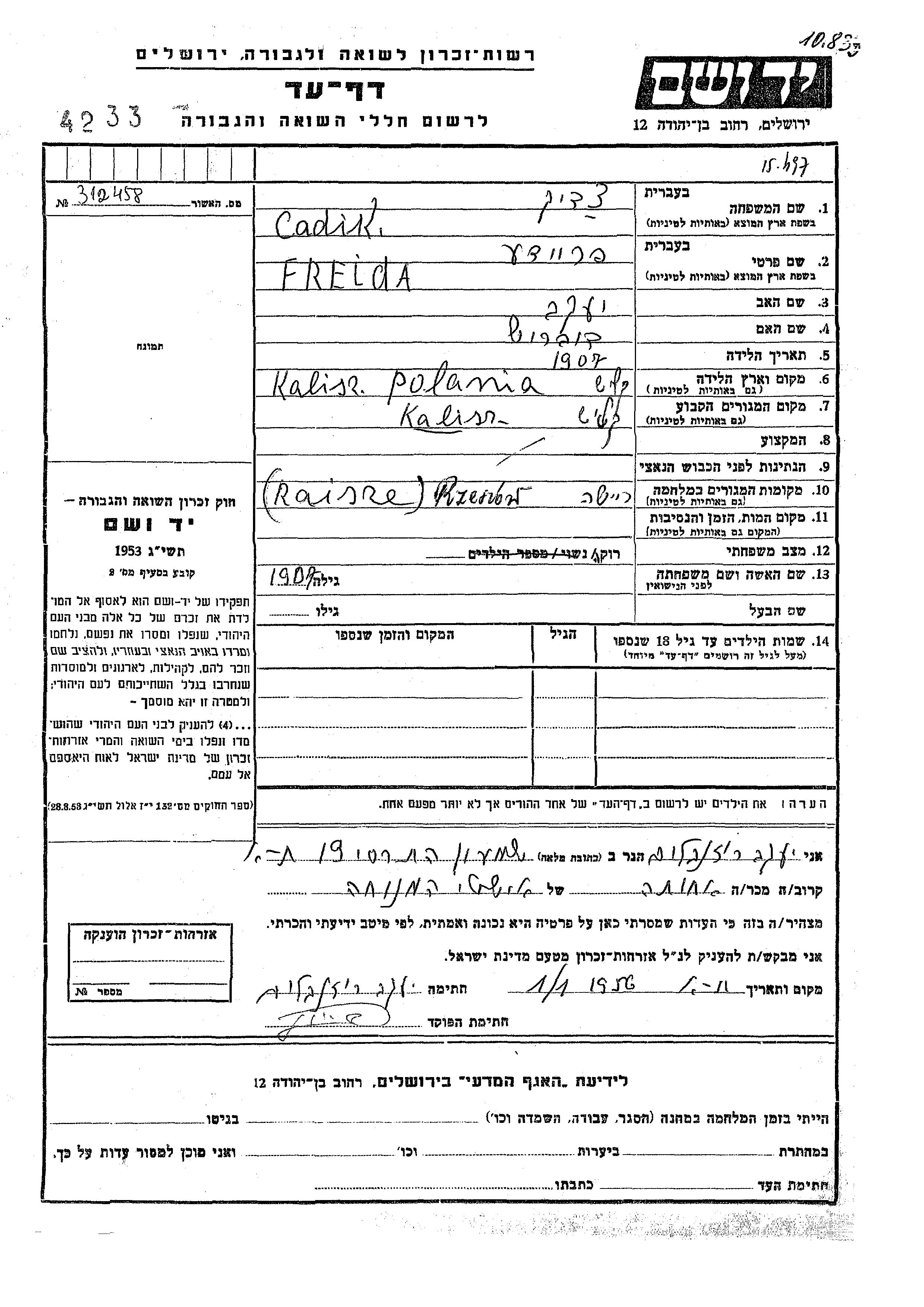 Freide Cadik wurde im Jahr 1907 in Kalisz, Polen geboren. Sie war die Tochter von Yaakov und Dobra. Sie war Ledig. Vor dem Zweiten Weltkrieg lebte sie in Kalisz, Polen. Während des Krieges war sie in Rzeszow, Polen.