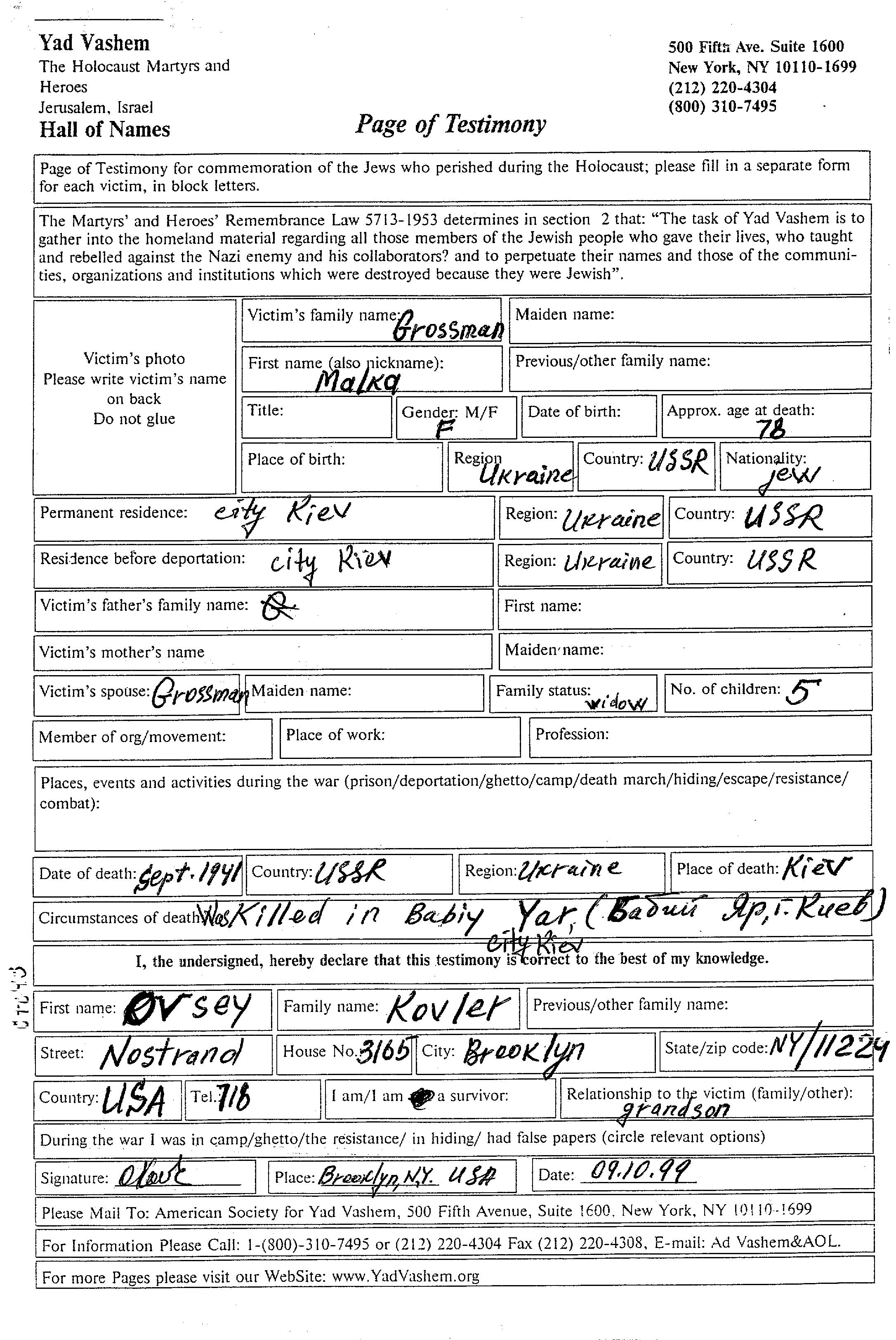 Malka Grossman wurde in Ukraine (UdSSR) geboren. Sie war Witwe. Vor dem Zweiten Weltkrieg lebte sie in Kiyev, Ukraine (UdSSR). Während des Krieges war sie in Kiyev, Ukraine (UdSSR).