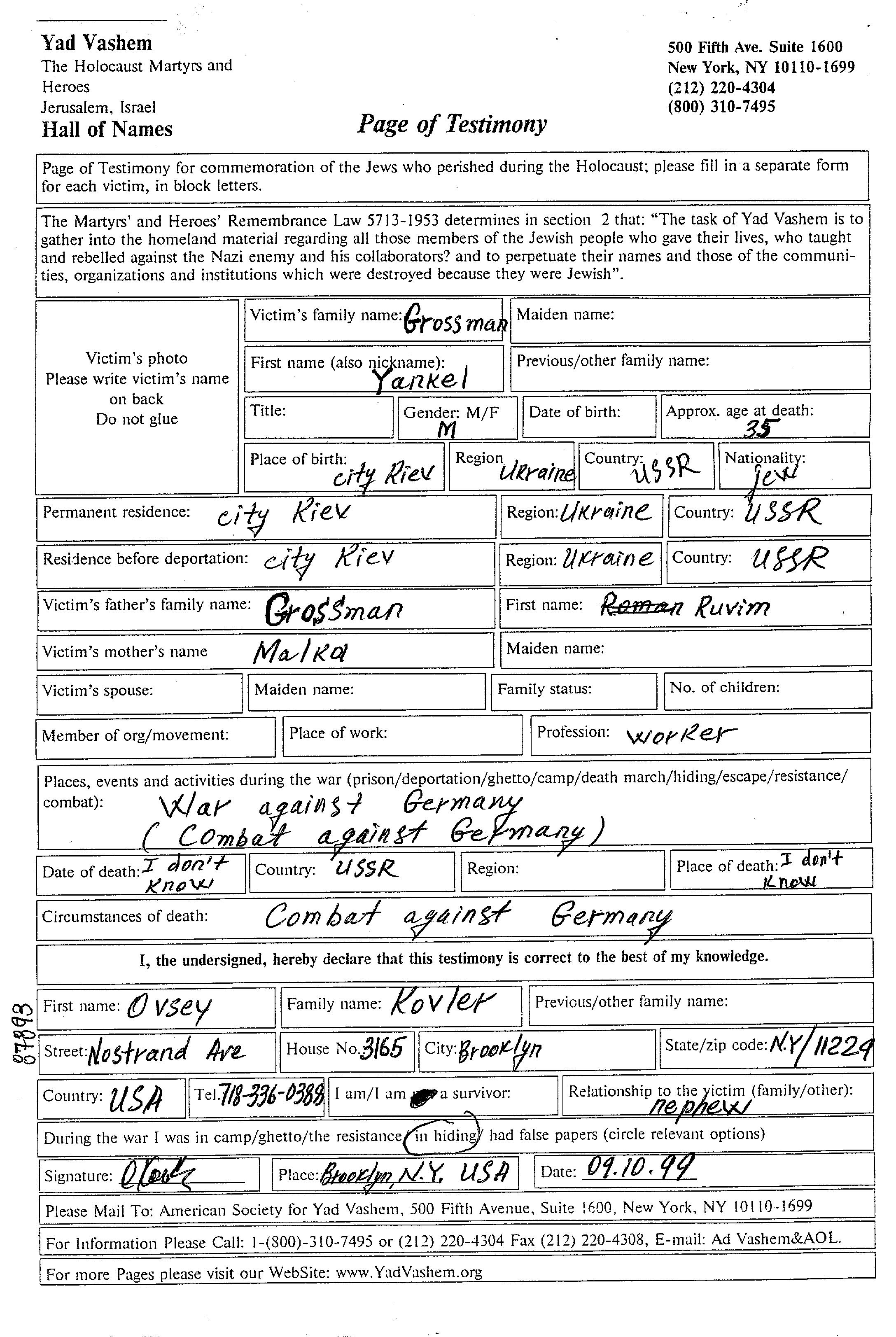 Yankel Grossman wurde in Kiev, Ukraine (UdSSR) geboren. Er war der Sohn von Ruvim und Malka. Er war Arbeiter/-in. Vor dem Zweiten Weltkrieg lebte er in Kiev, Ukraine (UdSSR). Während des Krieges war er in die Sowjetischen Streitkräfte.