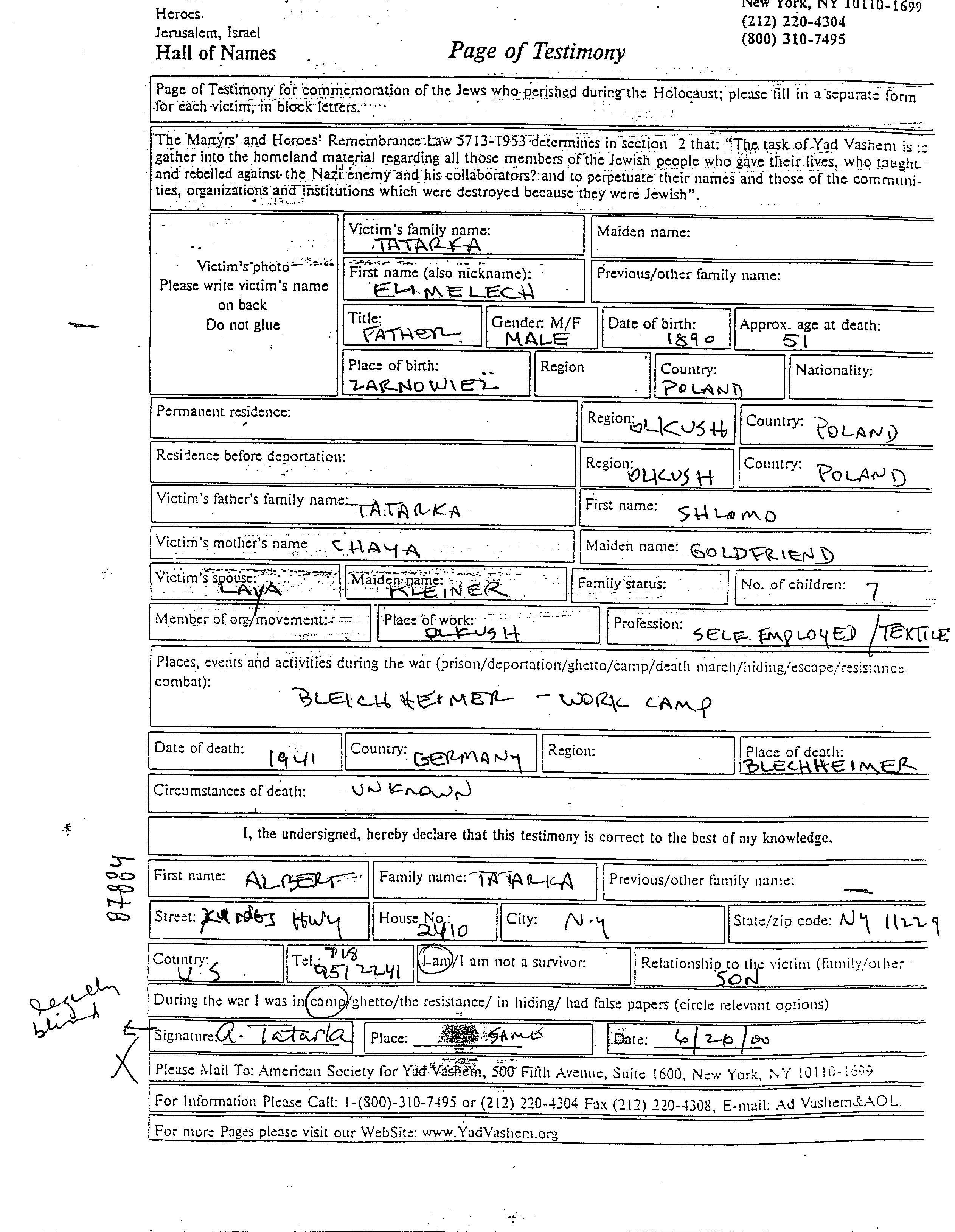 Elimelech Tatarka wurde im Jahr 1890 in Zarnowiec, Polen geboren. Er war der Sohn von Shlomo und Chaya. Er war Selbständig und mit Laya, geb. Kleiner Verheiratet. Vor dem Zweiten Weltkrieg lebte er in Olkush, Polen. Während des Krieges war er in Olkush, Polen.