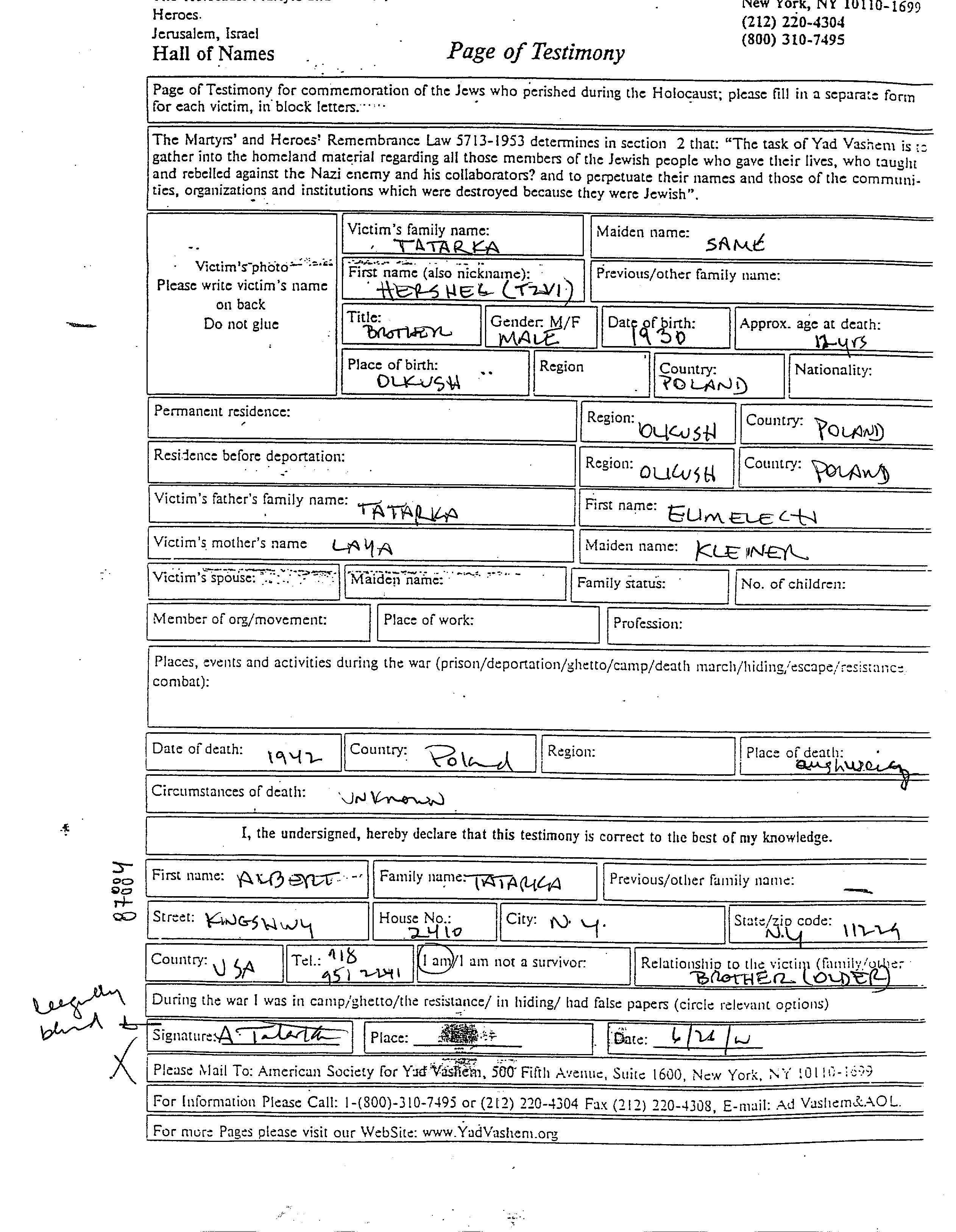Hershel Tzvi Tatarka wurde im Jahr 1930 in Olkush, Polen geboren. Er war der Sohn von Elimelech und Laya. Er war Kind. Vor dem Zweiten Weltkrieg lebte er in Olkush, Polen. Während des Krieges war er in Olkush, Polen.