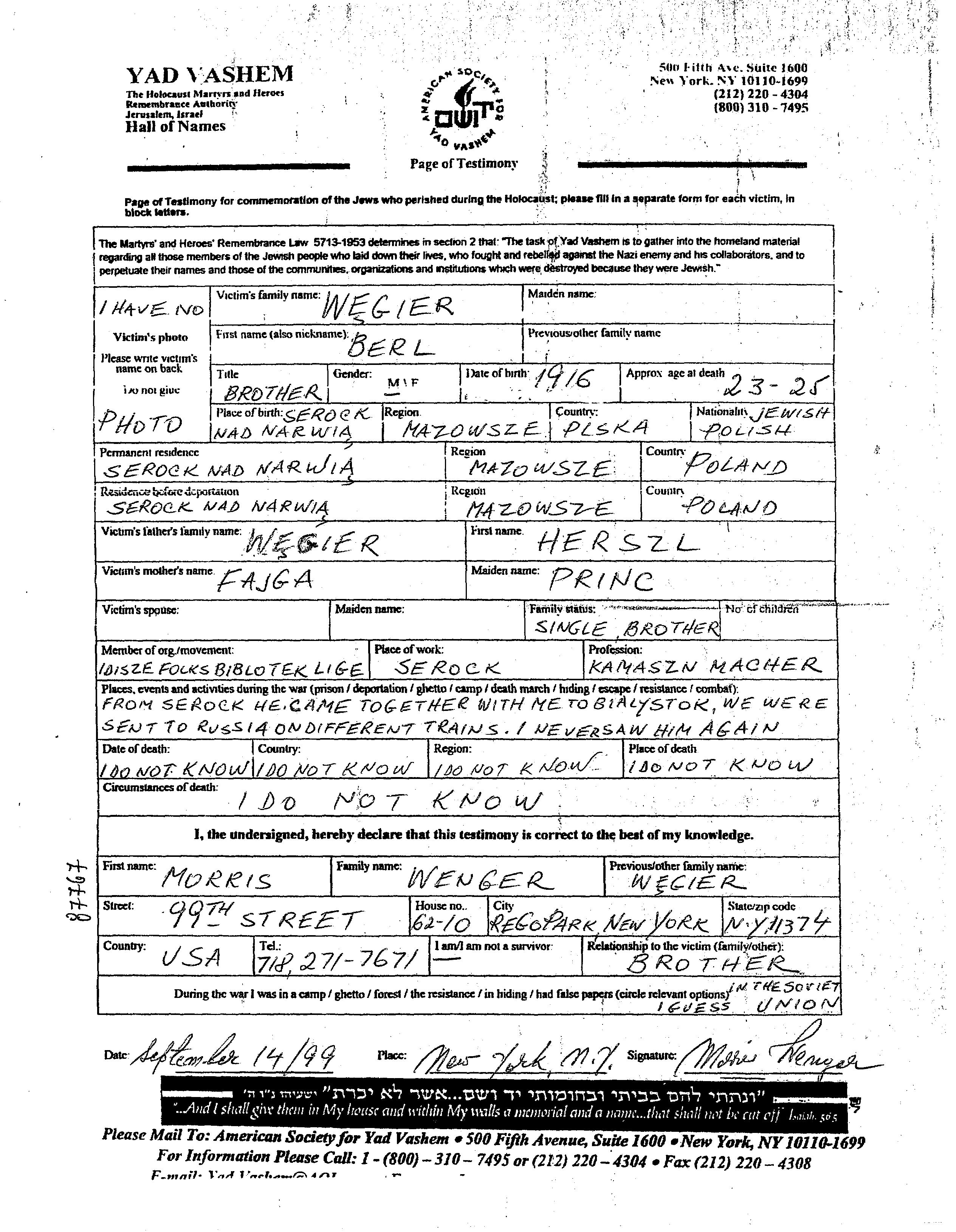 Berl Wegier wurde im Jahr 1916 in Serock, Polen geboren. Er war der Sohn von Herszl und Fajga. Er war Schuhzuschneider und Ledig. Vor dem Zweiten Weltkrieg lebte er in Serock, Polen. Während des Krieges war er in Serock, Polen.