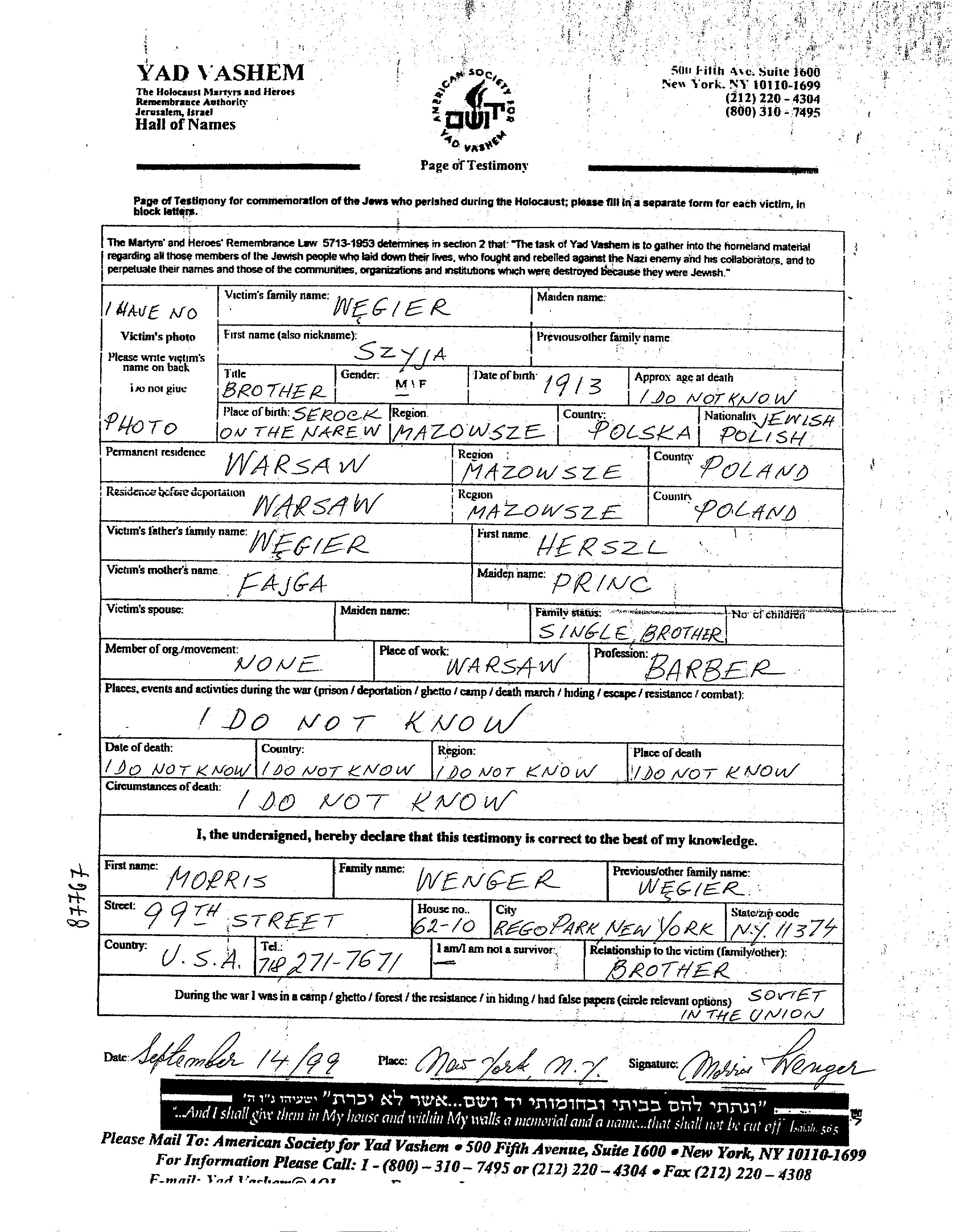 Szyja Wegier wurde im Jahr 1913 in Serock, Polen geboren. Er war der Sohn von Herszl und Fajga. Er war Friseur/-in und Ledig. Vor dem Zweiten Weltkrieg lebte er in Warszawa, Polen.