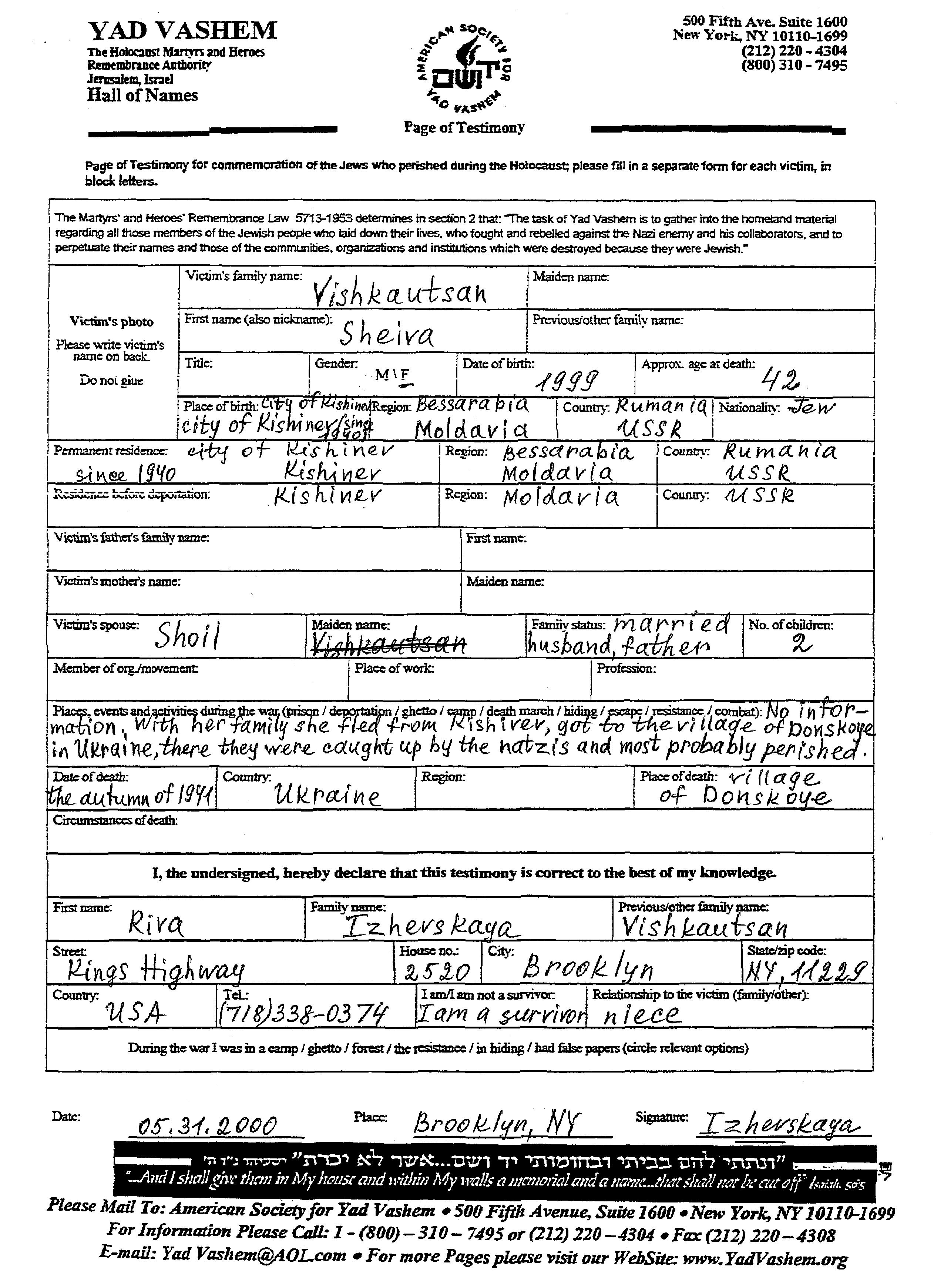 Sheiva Vishkautsan wurde im Jahr 1899 in Kishinev, Rumänien geboren. Sie war mit Shaul Verheiratet. Vor dem Zweiten Weltkrieg lebte sie in Kishinev, Rumänien. Während des Krieges war sie in Kishinev, Rumänien.