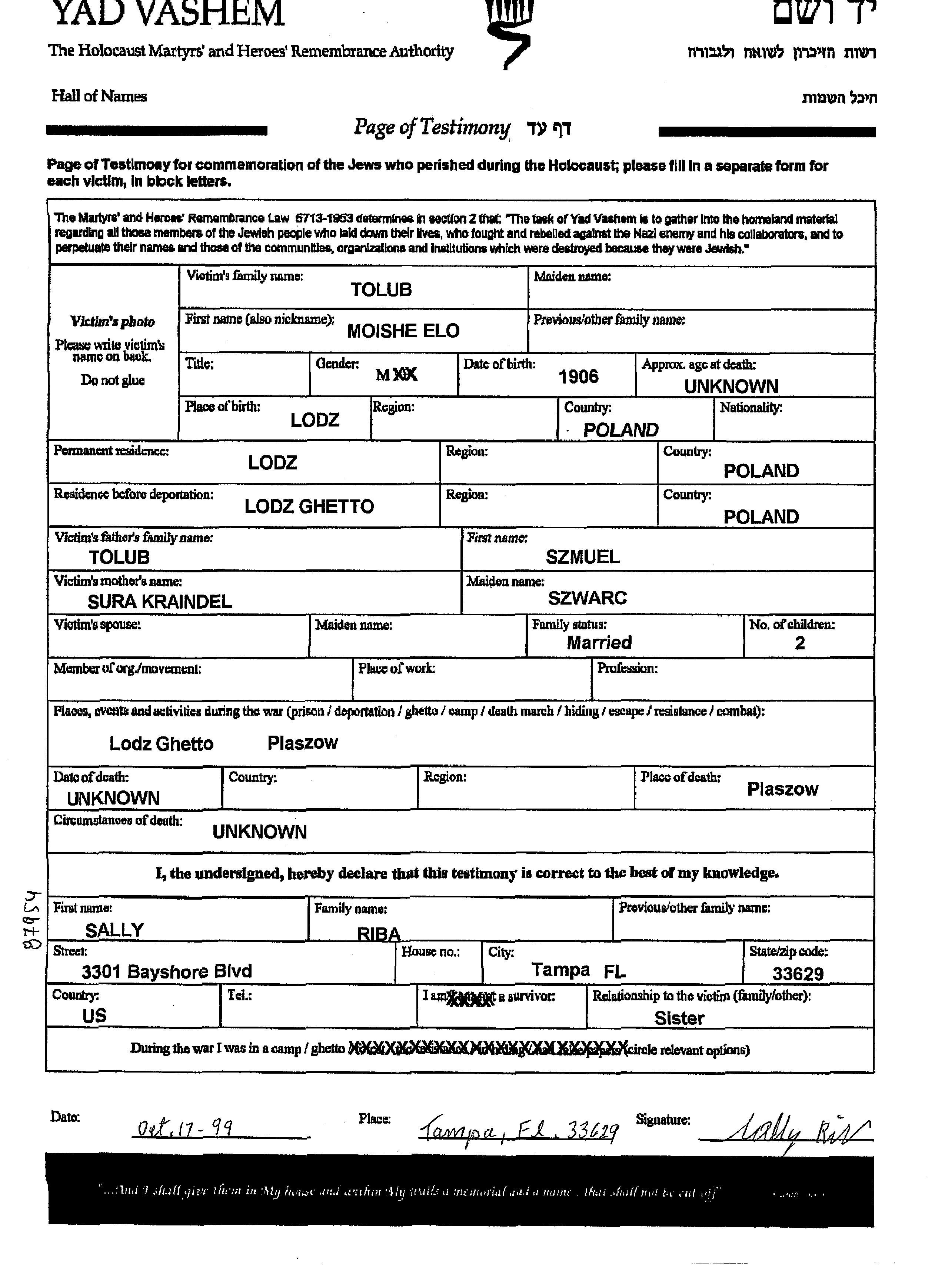 Moishe Elo Tolub wurde im Jahr 1906 in Lodz, Polen geboren. Er war der Sohn von Szmuel und Sura Kraindel. Er war Verheiratet. Vor dem Zweiten Weltkrieg lebte er in Lodz, Polen. Während des Krieges war er in Lodz, Polen.