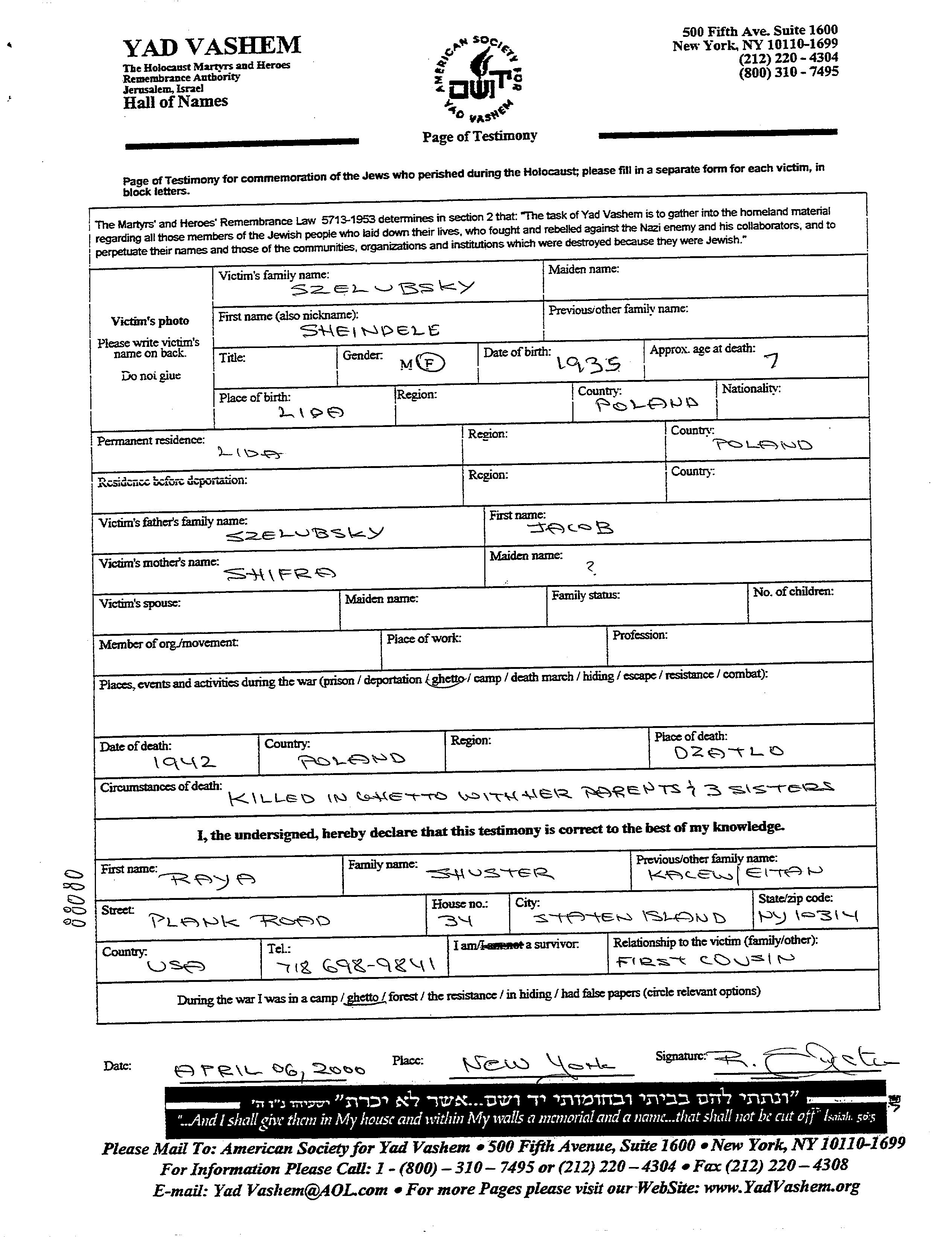 Juden wurden in der Schoah auf verschiedenste Weisen ermordet, unter anderem: Vergasen, Erschiessen, lebendig verbrannt werden, lebendig begraben werden, Tod durch Erschöpfung durch Zwangsarbeit, Epidemien, mangels jeder hygienischer Bedingung oder dem Fehlen medizinischer Versorgung. Manche Juden nahmen sich das Leben, um der Festnahme und weiterer Verfolgung zu entgehen oder ihr hoffnungsloses, nicht nachlassendes Leiden zu beenden.