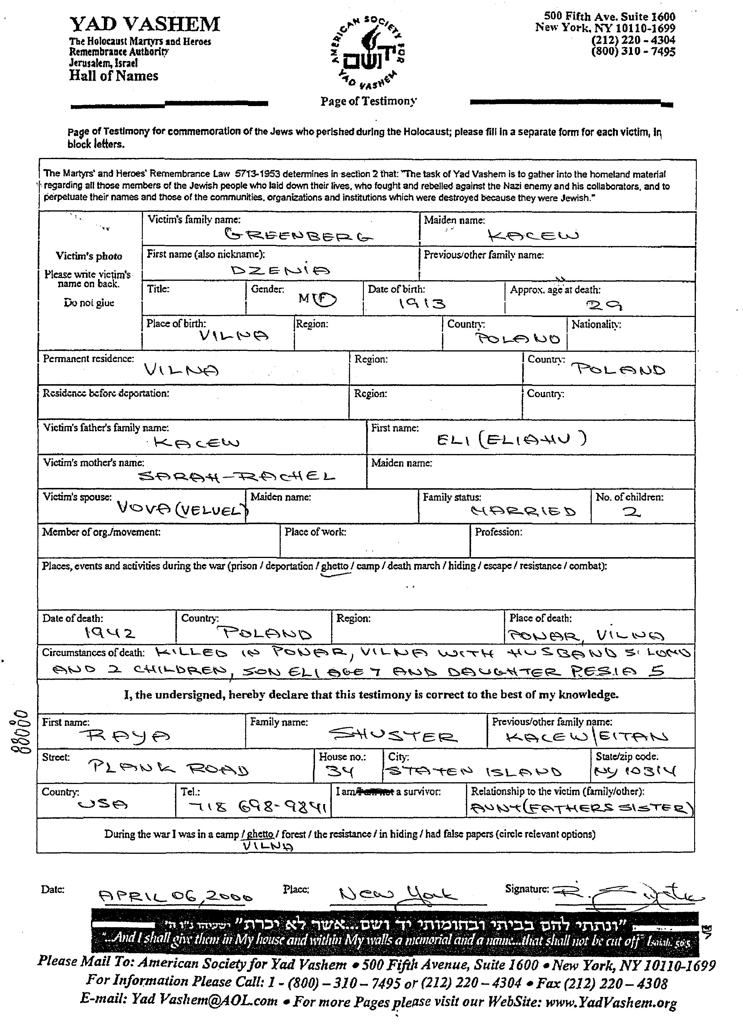 Dzenia Greenberg, geb. Kacew wurde im Jahr 1913 in Wilna, Polen geboren. Sie war die Tochter von Eli und Sarah Rachel. Sie war mit Vova Velvel Verheiratet. Vor dem Zweiten Weltkrieg lebte sie in Wilna, Polen.